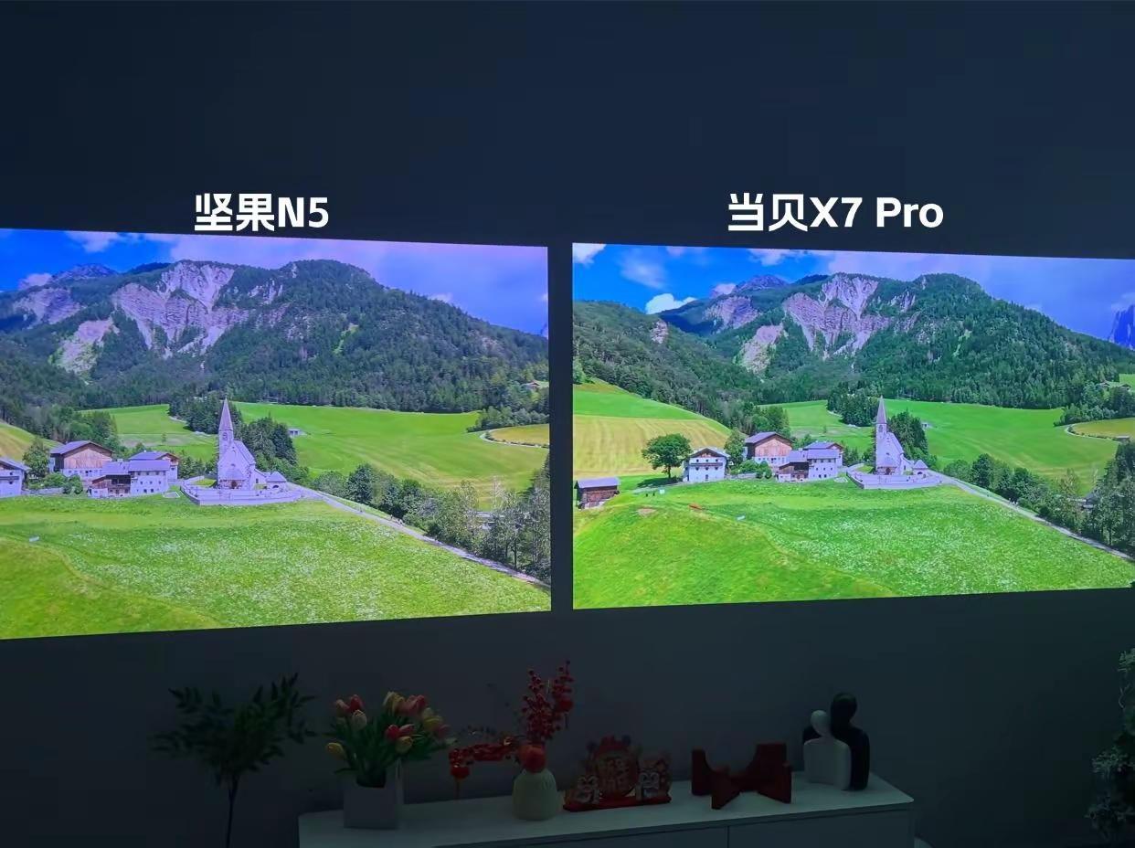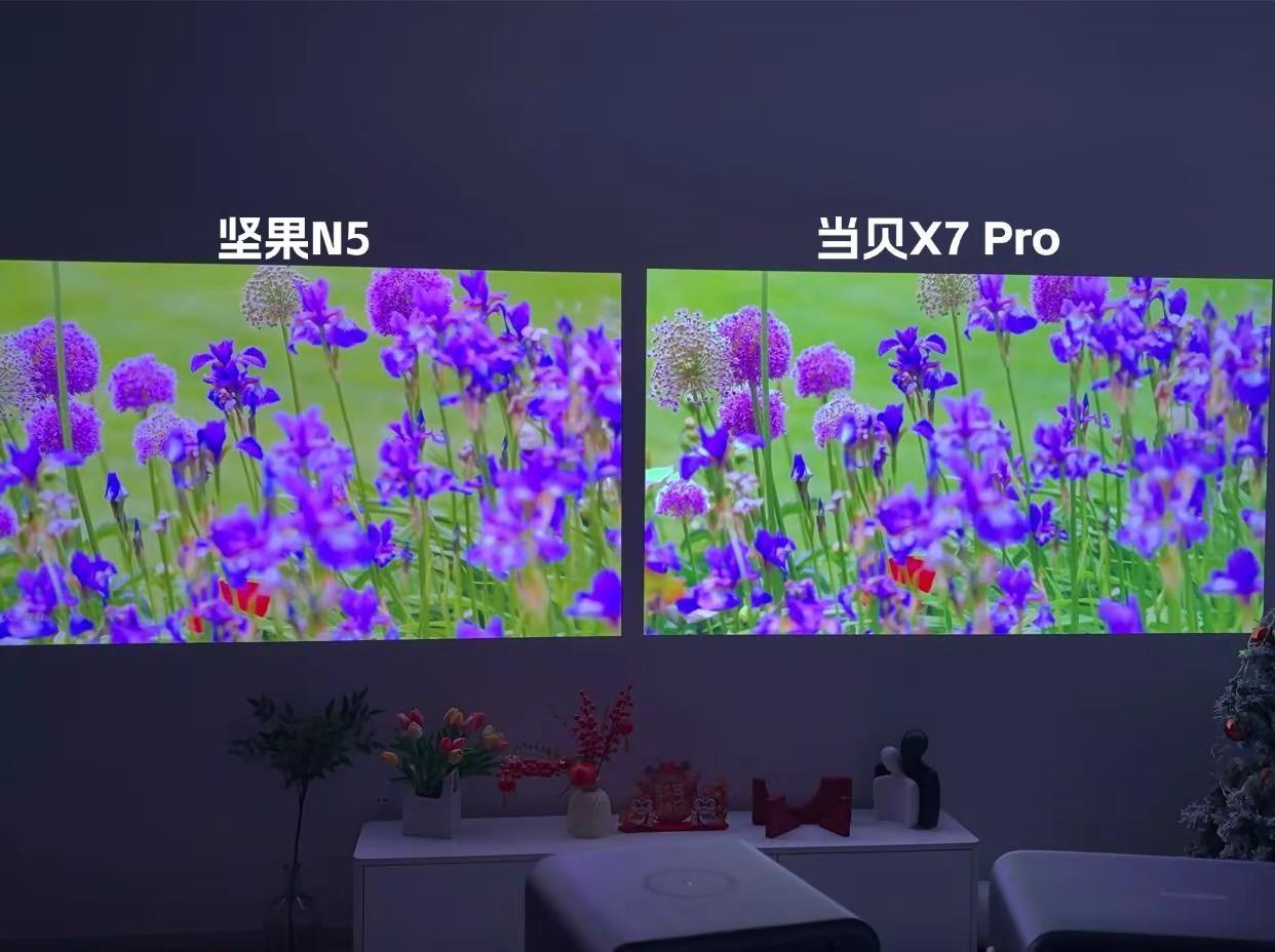 客厅投影仪怎么选?实测两款热门款。终于把两款风很大的家用投影仪都安排上了!分别是当贝x7pro和坚果n5,不玩虚的,纯真实使用测评,重点说大家最关心的画质细节~先看核心的观影画质,晚上拉满窗帘实测,两款亮度日常用都够用,开小灯看也不会模糊,不过细节上还是有一些区别的,个人觉得当贝x7pro的色彩会比较贴近真实,没有过度饱和的假感。最关键的是,它没有色边和散斑问题,文字、人物轮廓都很清晰,长时间观看没有感觉到眼睛的不适;坚果n5画面偶尔会有淡淡的色边,色彩整体偏冷调,这个色彩因人而异,大家最好都看一下选适合自己的就行整体来说,两款都是同价位有竞争力的选手,没有绝对的好坏。看重色彩精准、无色边无散斑,追求舒适观影体验的,可以选当贝x7pro;日常简单观影的、比较看重音质的,可考虑坚果n5,按需冲就对啦~当贝x7pro 坚果n5 测评 家用投影仪 投影仪