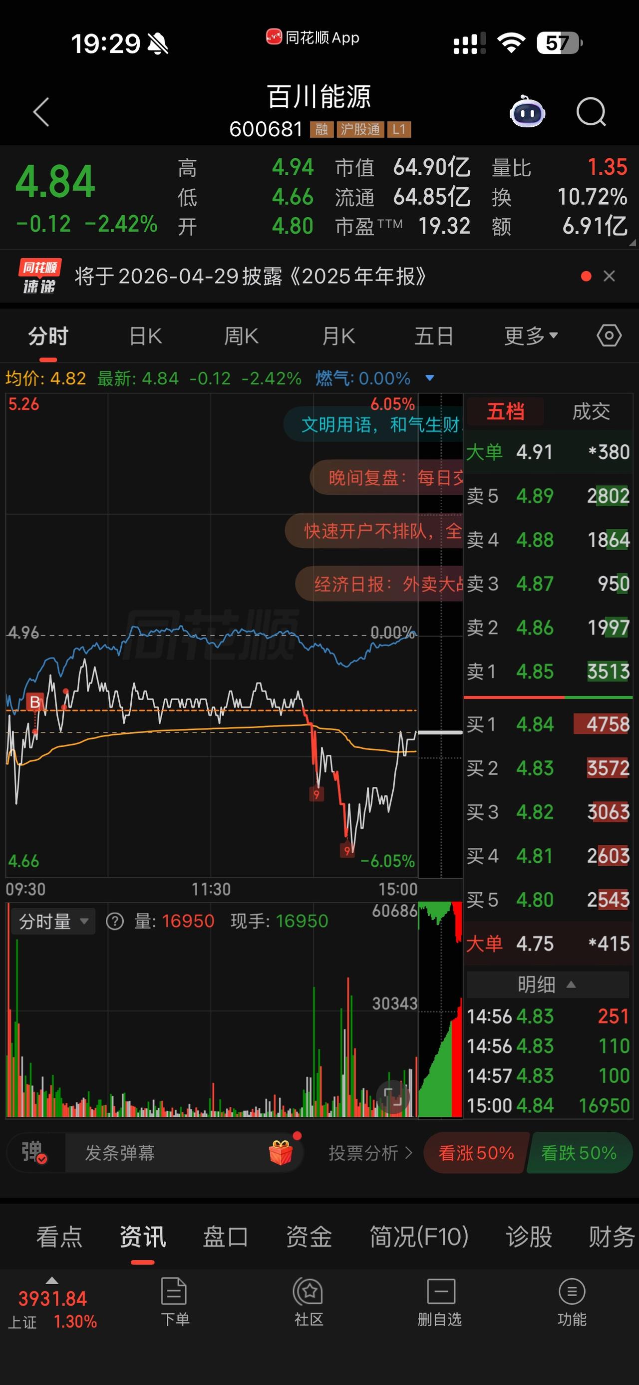 是洗盘还是出货? 更倾向于洗盘,而非出货。 核心判断依据 1. 位置与趋势:股价处于相对低位,近一年涨幅约53%,但近期回调幅度有限,未出现明显高位派发迹象。 2. 分时走势:早盘冲高后震荡回落,尾盘快速拉升收回大部分跌幅,形成“长下影线”,是典型的洗盘吸筹特征。 3. 量能与换手:当日换手率10.72%,量比1.35,成交活跃但未出现放量暴跌,尾盘拉升伴随明显资金承接。 4. 资金流向:虽有小幅净流出,但整体波动不大,未出现主力大规模出逃的迹象。 洗盘与出货的关键区别 • 洗盘:急跌后快速收回,尾盘拉升,量能温和,目的是清洗浮筹。 • 出货:高位放量暴跌,尾盘无承接,资金持续大幅流出。 操作建议 • 短期关注4.66元支撑位,不破则洗盘概率大。 • 若放量突破4.94元前日高点,可确认洗盘结束,趋势延续。