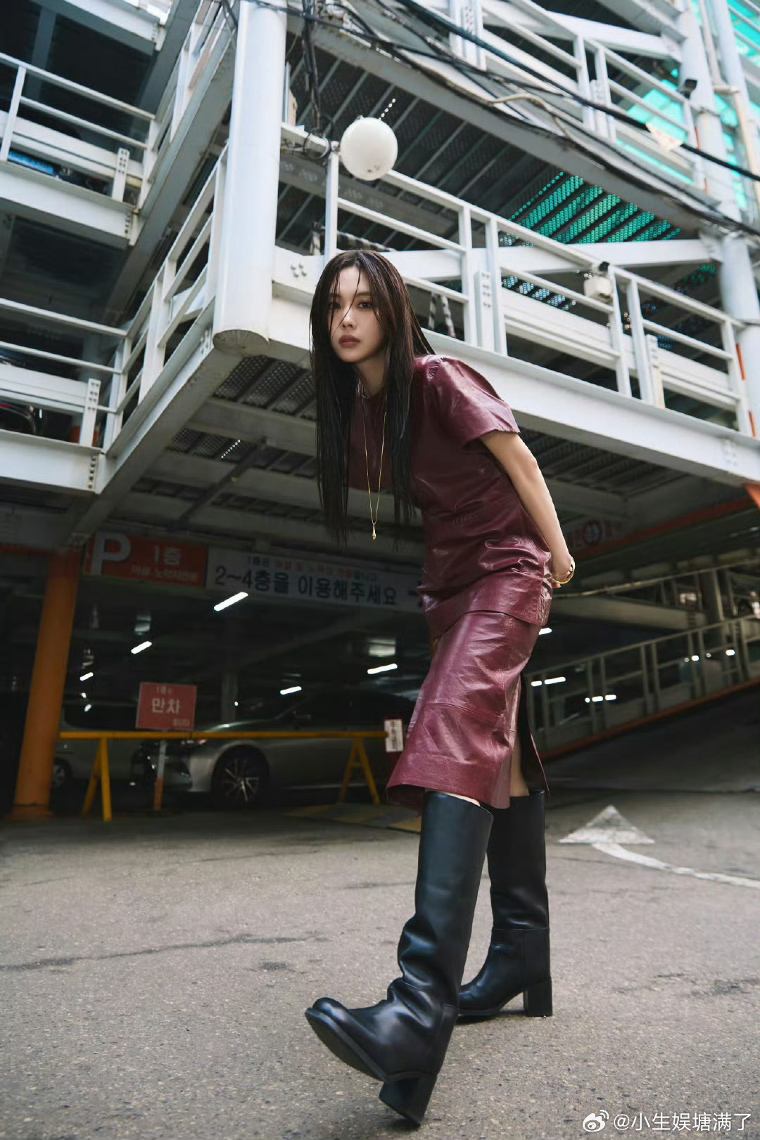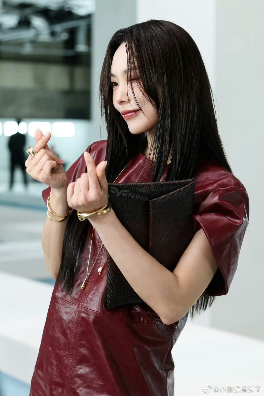 王霏霏湿发红皮裙氛围感直接拉满!湿发勾勒精致轮廓,红皮裙衬得气场全开,又美又飒太