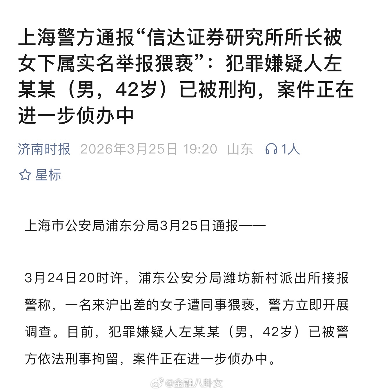 上海警方通报“信达证券研究所所长被女下属实名举报猥亵”:犯罪嫌疑人左某某(男,4