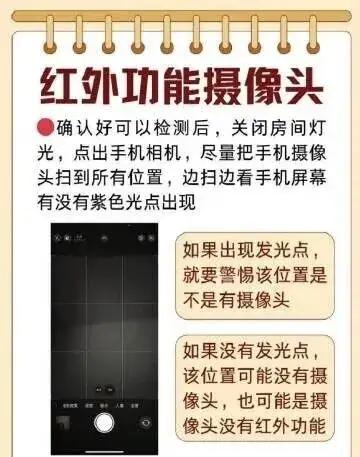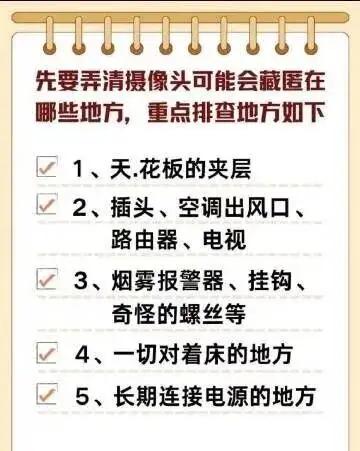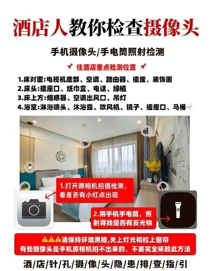 住酒店先别连WiFi,花3分钟做这件事,可能救你一命 酒店偷拍设备正在变得越来越隐蔽:直径0.2厘米的“米粒摄像头”,可藏进烟雾报警器、插座孔、沐浴露瓶身;独立4G传输设备不接酒店WiFi,直接上传云端。偷拍已成黑色产业链——设备成本几十元,视频却能卖到几百上千元。 普通人防偷拍,不需要专业设备。三分钟自检法:关灯后用手电筒照射房间顶部、中部、下部,镜头会呈现规则圆形反光点;用手机摄像头扫一圈,红外设备可能发出红光;手指贴镜测试,可识破双向透视镜。 隐私不能靠运气。住进房间的第一件事,不是连WiFi,而是检查房间。多留一个心眼,永远不嫌多。 互动话题: 你住酒店时有过“感觉不对劲”的经历吗?评论区聊聊,给车友们提个醒!酒店偷拍探测器 偷窥摄像头 包厢摄像头 酒店防偷窥技巧 反监控防拍酒店 酒店宾馆防偷窥 深圳酒店偷拍 隐私探测器 酒店隐形收费 成都酒店偷拍 酒店安全技巧 酒店探头 酒店防偷窥仪 酒店防窥检测仪 酒店扫瞄网