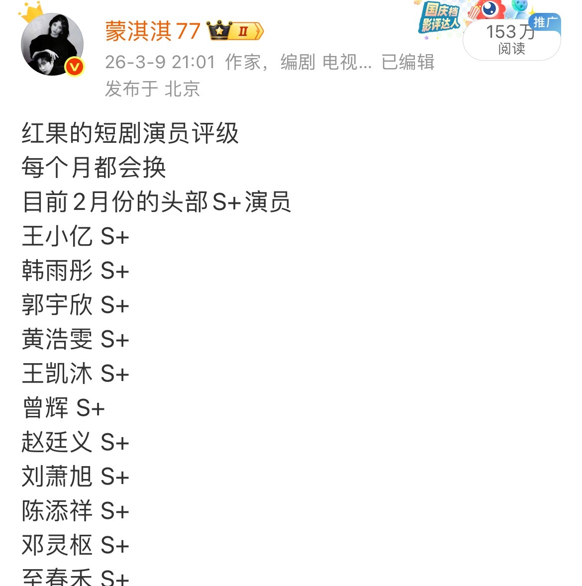 为什么要嘲人家黄浩雯?他一直就是红果头部每个月更新的S+榜单上,月月都有他!!!央戏科班,很有男人魅力!业内口碑好!!拿希思黎挚友实至名归