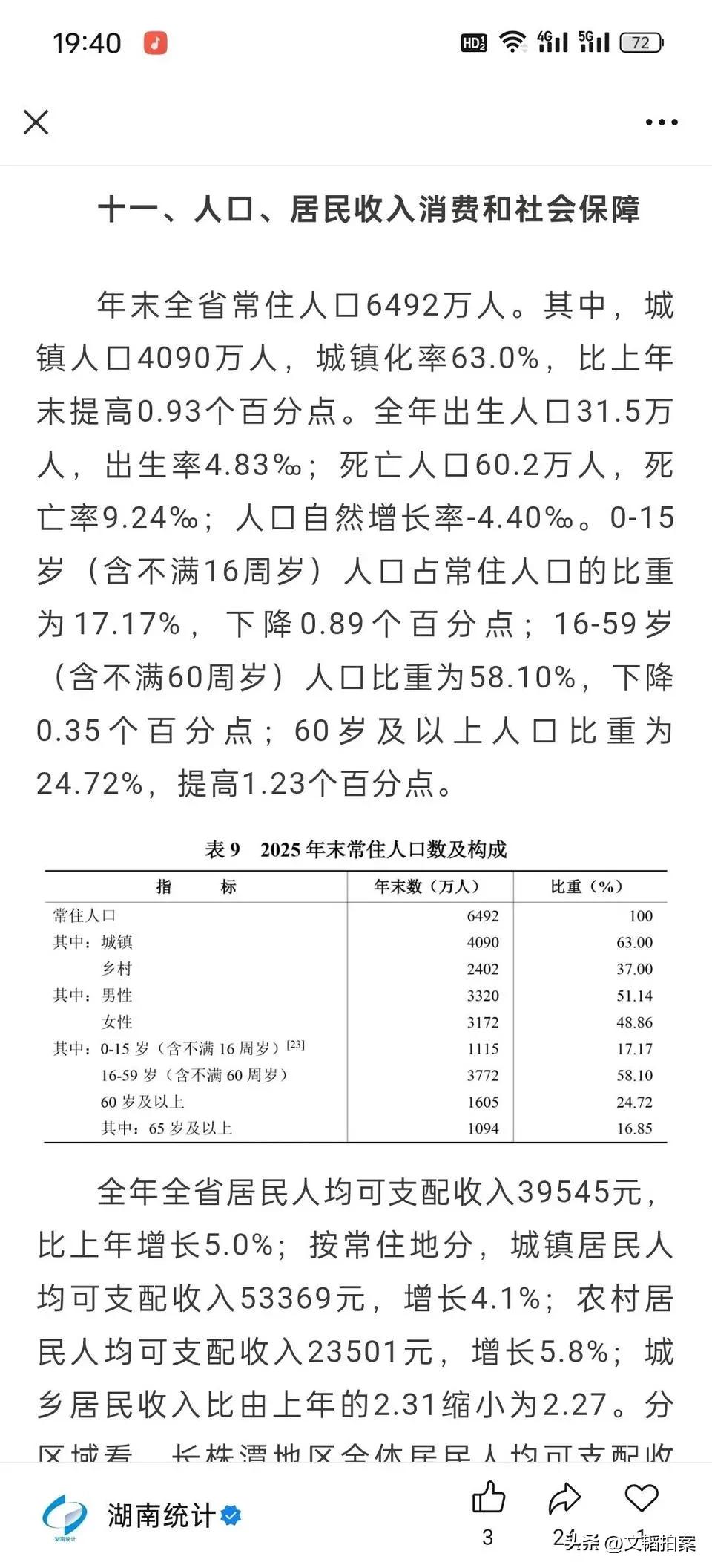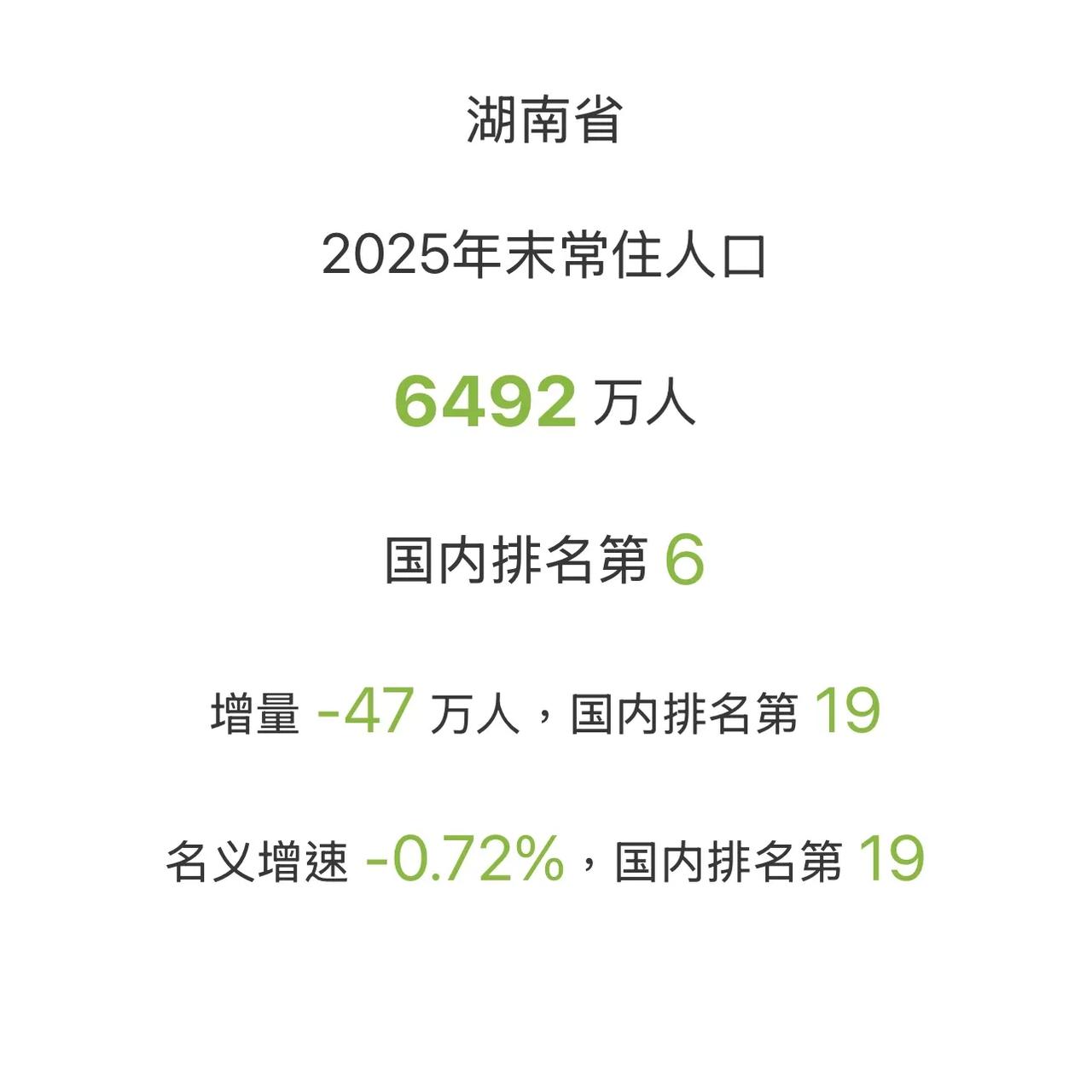 湖南2025年常住人口数据公布,已经完全和东北三省肩并肩了,甚至更为显著。 湖南是户籍人口超7000万的大省,2025年出生人口仅31.5万人,低于韩国水平。60岁以上人口比例为24.72%,也就是说湖南现在有四分之一的人口是超过60岁的。 人口数据反映了湖南这些年的发展趋势,形势如何?现在可以说湖南是南方的东北了吧?中国人口走势 人口数量分布图 人口大排行 常住人口数据