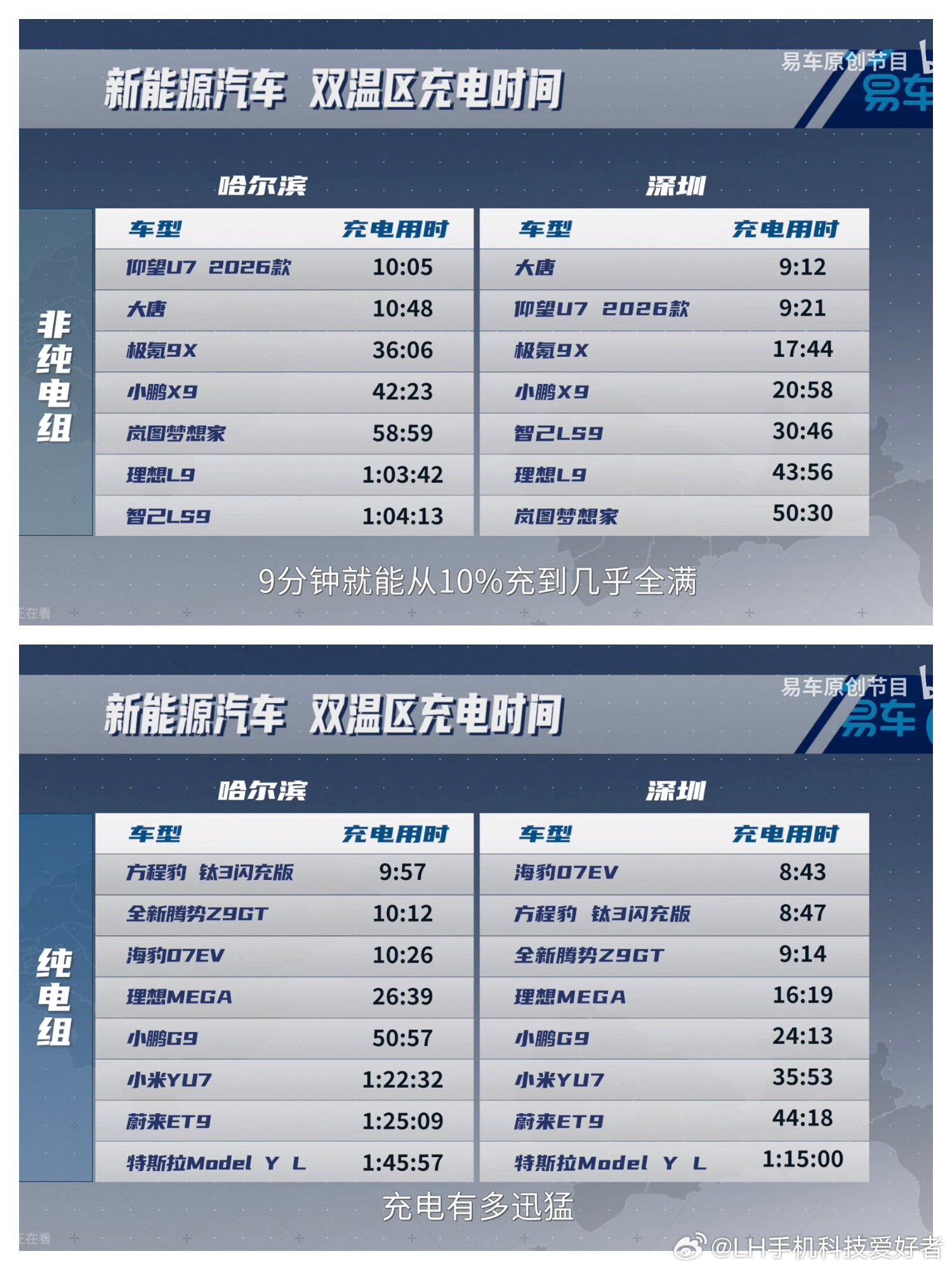 可以看到,基本上比亚迪闪充车型是断层式领先的,无论是常温环境还是零下十几度的哈尔滨,比亚迪的车型都是9分钟、10分钟这个区间充饱的。无论是插电混动还是纯电,都是遥遥领先的存在。