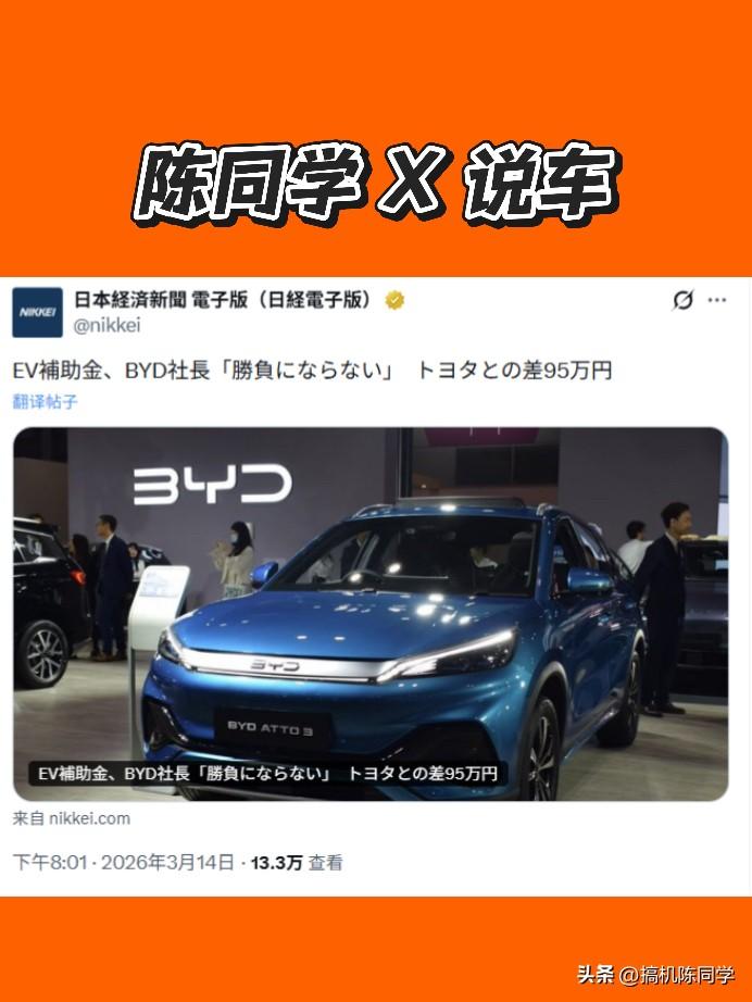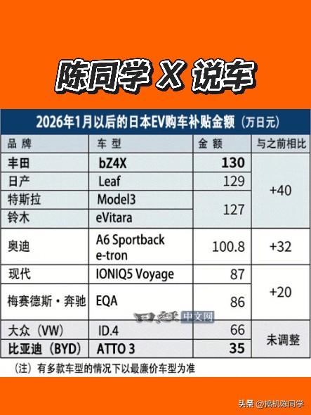 日本EV补贴双标太离谱!比亚迪硬核实力破局打脸 日本上调电动车补贴玩起明晃晃的双标!最高补助提至130万日元,丰田、日产、特斯拉等日系美系品牌吃满红利,比亚迪多款纯电车型补贴却纹丝不动,与同级竞品差距最高达95万日元,赤裸裸的排他性政策实锤!标普分析师都直言,这就是政府明晃晃的政策倾斜。 日本补贴双重标准,但偏见和壁垒,挡不住硬实力!作为首个进军日本市场的中国车企,比亚迪两年多建超66家网点,还是唯一参展东京车展的中国品牌,更量身打造K-EV RACOO、推出海狮06 DM-i丰富产品矩阵。 销量更是直接说话:2025年在日纯电销量3870辆、同比涨62%,直接超越丰田;2026年2月单月销量同比激增153%!靠刀片电池、DM-i混动等全栈核心技术,比亚迪用产品力和长期主义,在日本市场硬生生趟出一条路,这才是中国车企的出海底气!日本电动车补贴双标