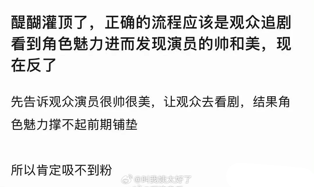 以前是演出来角色魅力进而发现演员帅和美,现在完全相反,先强调演员帅和美引导观众去看剧,结果没有角色魅力…