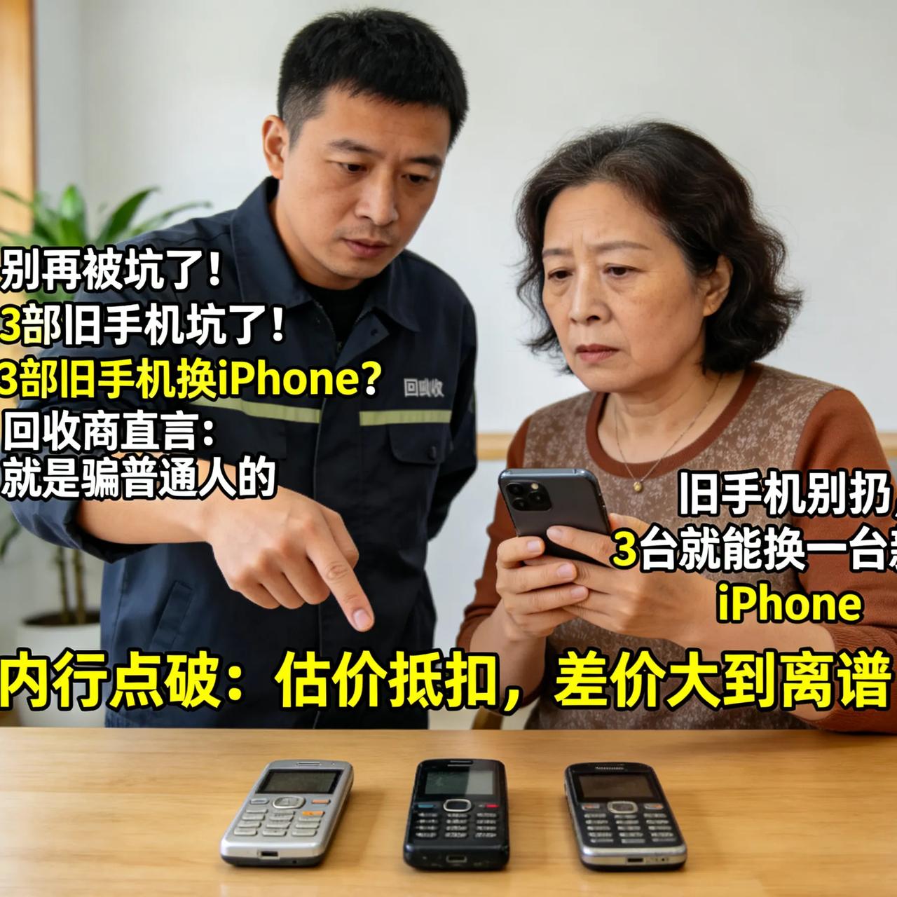 别再被坑了!3部旧手机换iPhone?回收商直言:就是骗普通人的 天天刷到这种视频: 旧手机别扔,3台就能换一台新iPhone。 不少人看得心动, 把家里淘汰的手机全翻出来, 真以为天上掉馅饼。 内行直接点破: 根本不是白给, 是估价抵扣,差价大到离谱。 老年机、旧安卓一台几十块, 三台加起来一两百, 连iPhone的零头都够不着。 更狠的是上门乱压价, 说好的价格到了就变卦, 卖完还担心手机信息泄露。 所谓以旧换新, 大多是引流套路, 专挑想占便宜的人下手。 贪小便宜吃大亏, 这话真没说错。 你被这种回收宣传骗过吗? 遇到压价你会忍气吞声吗? 旧手机回收 以旧换新套路 防坑提醒旧手机行情 旧手机价值评估 防坑提醒 以旧换新套路