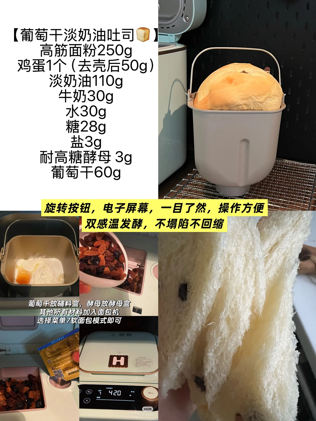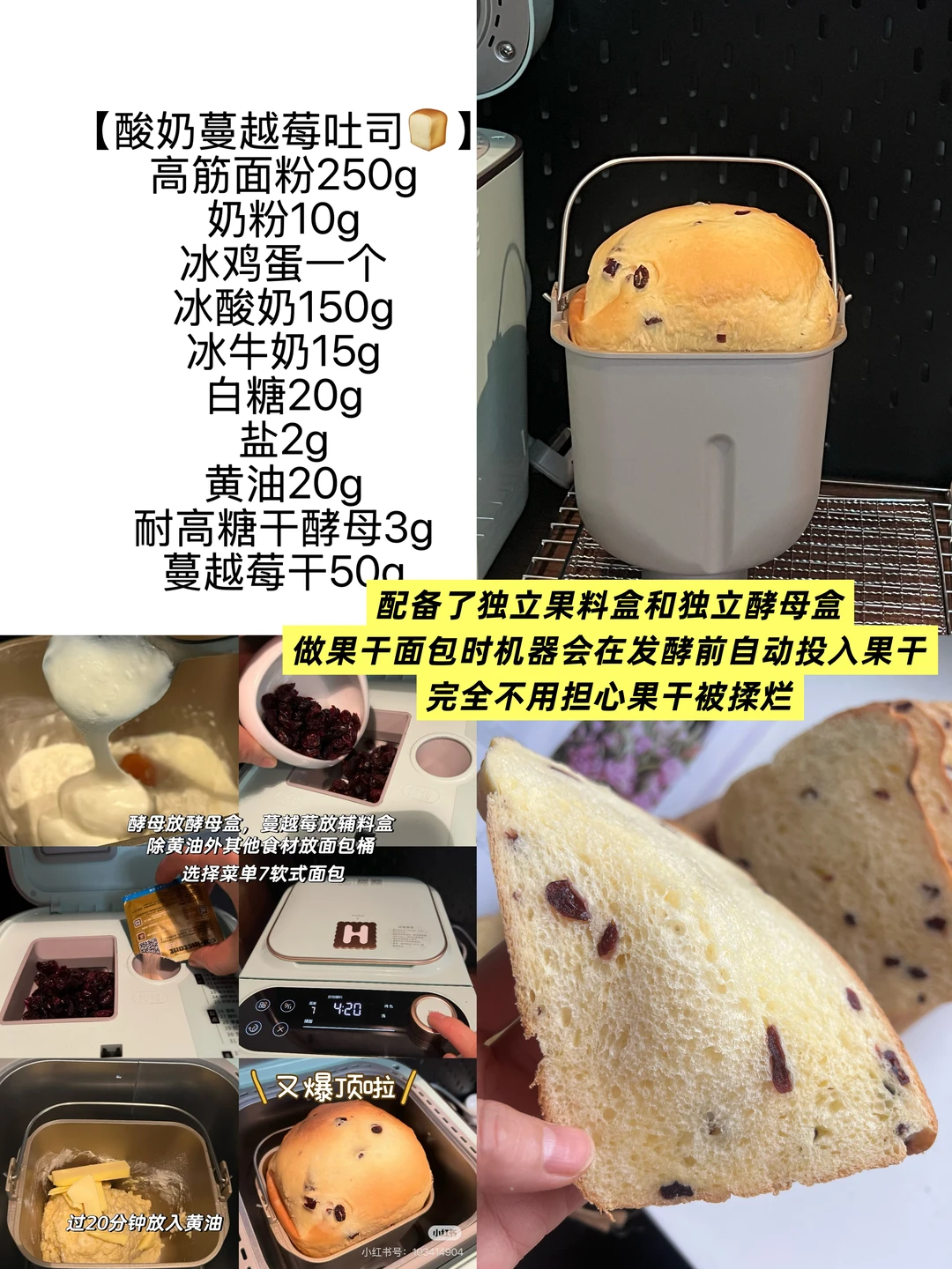 1️⃣除黄油外的食材放入面包桶(盐和糖对角放),酵母放入酵母盒,果干放入辅料盒