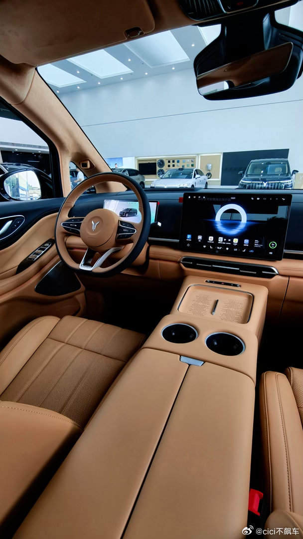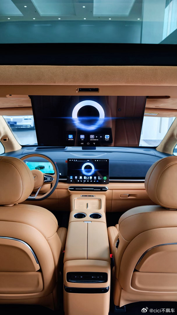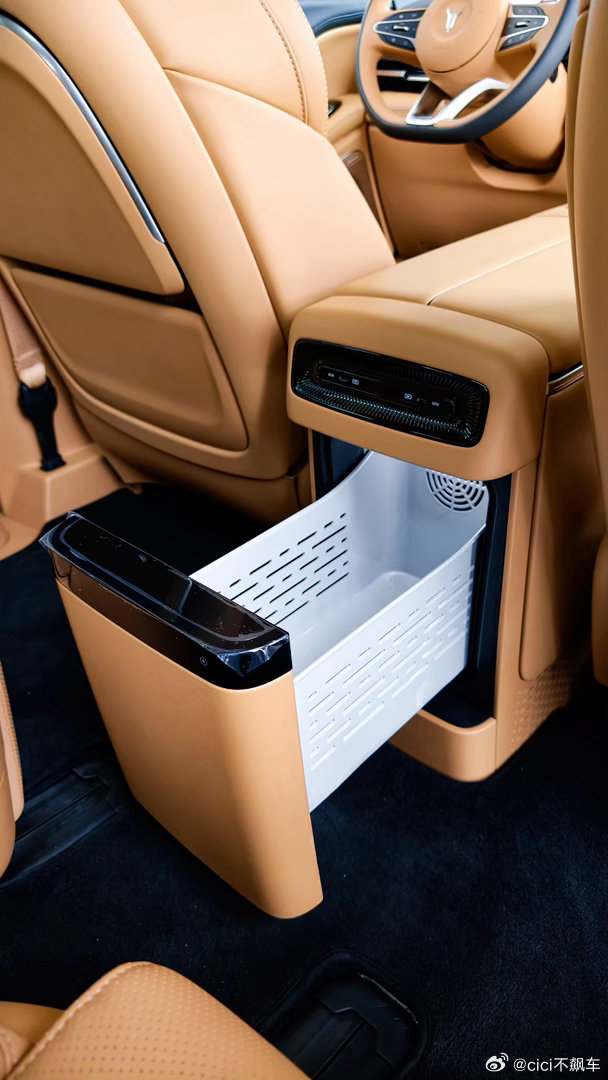 配置也很可以,二排SPA级悬浮重力座椅,加热通风按摩全都有,带有车载冰箱,后排大屏,采用的还是全铝前双叉臂+后五连杆