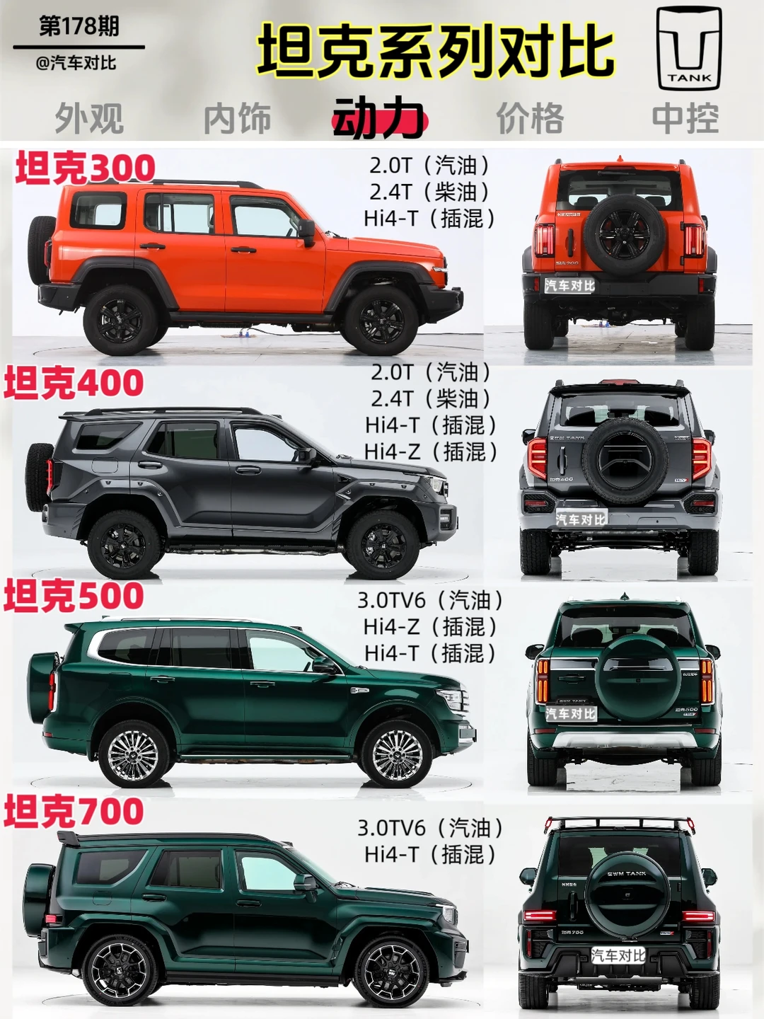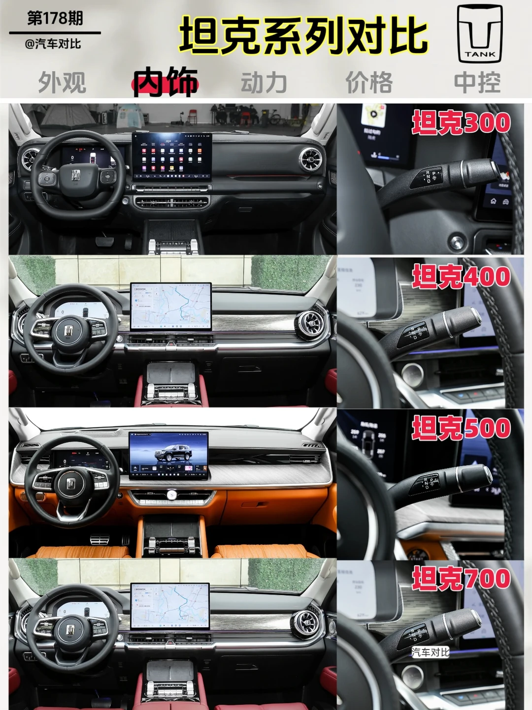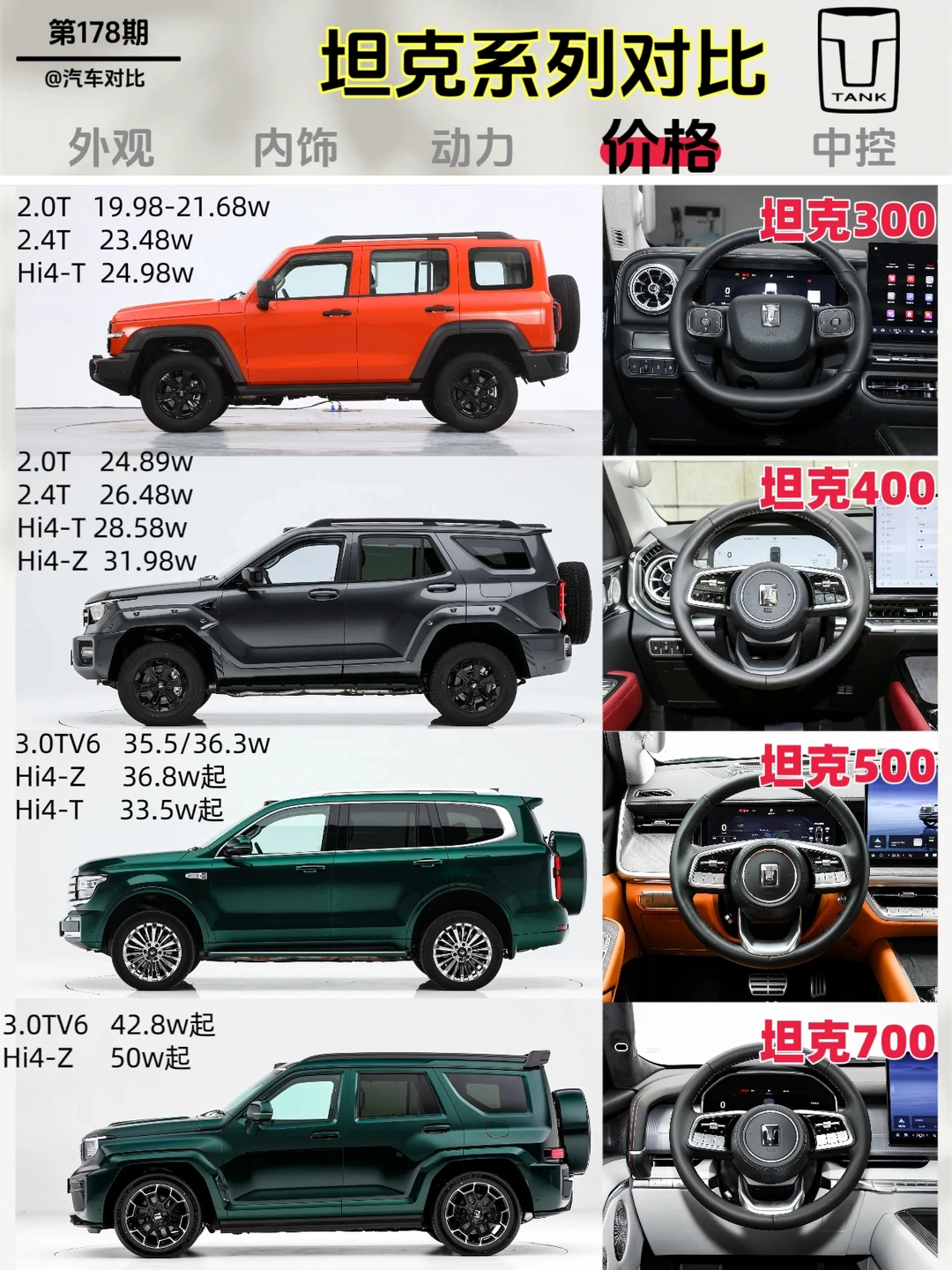 坦克300、坦克400、坦克500、坦克700外观、内饰、动力、价格、中控对比