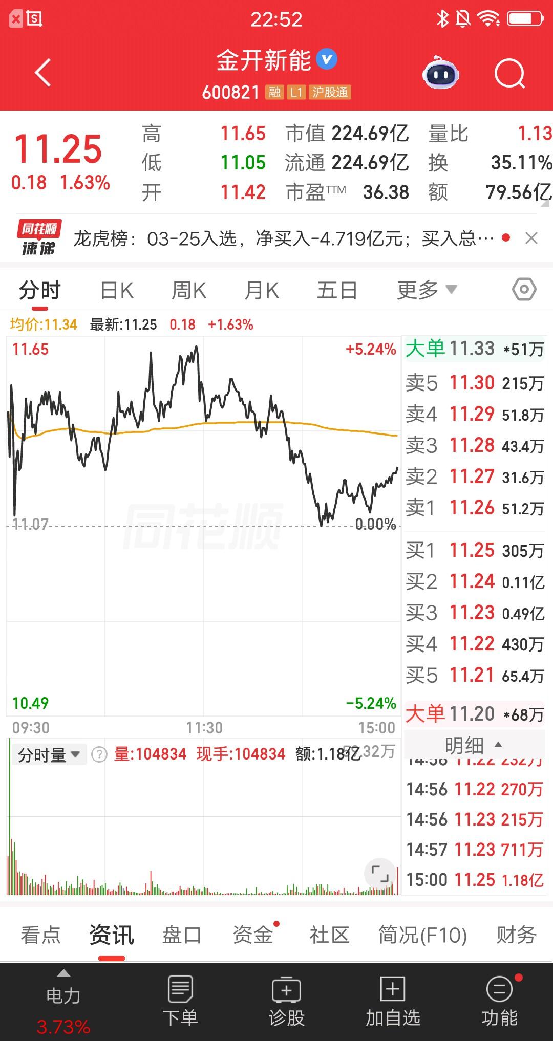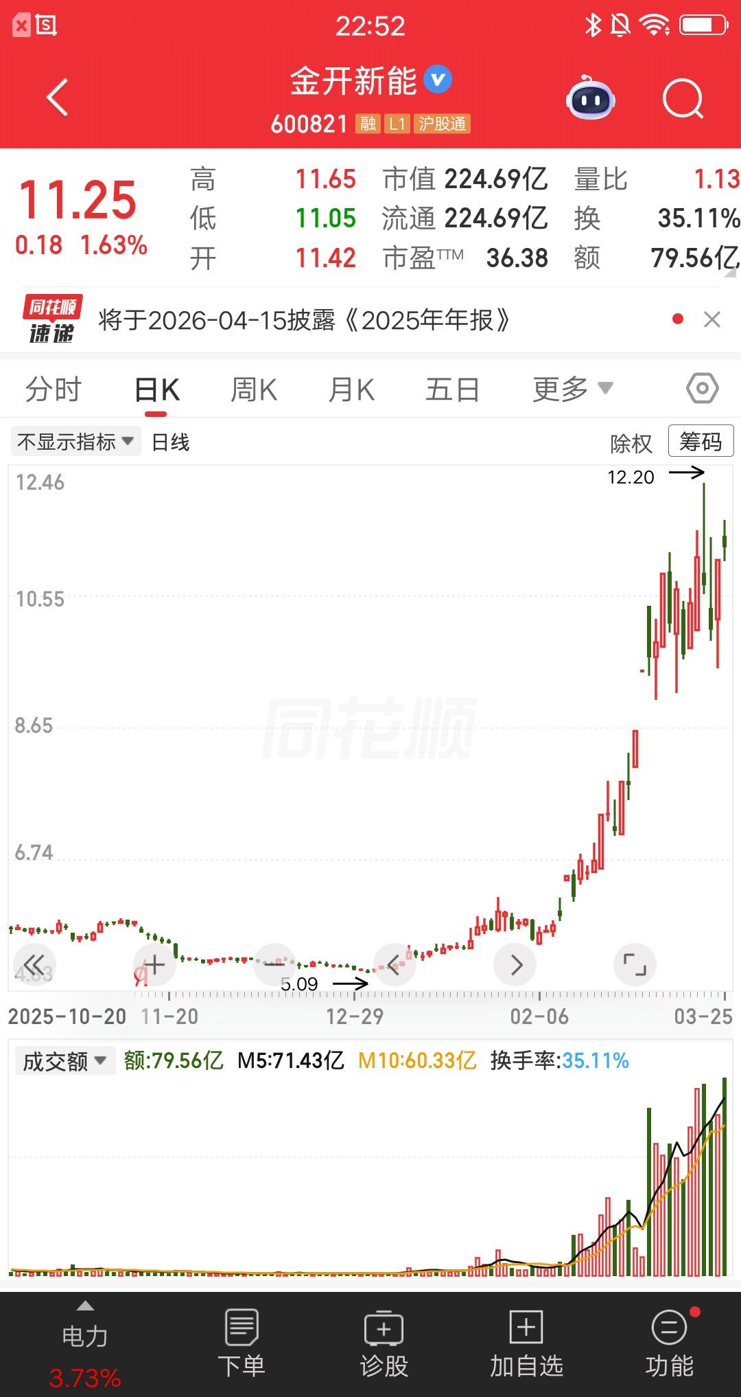 A股今天最惨的财经博主诞生了,支撑位就快跌破了,明天非常关键,30万的铁底能不能守住呀! 他在今天全仓梭哈了金开新能,当日盈亏3872.77元浮亏1.241%,市值还有308250元。金开新能全天都在零轴上方反复震荡,最大涨幅约5%。成交额79.56亿换手率35.11%,高位爆量换手。 友情提示,该财经博主赚钱就狂笑,亏钱就哭的稀里哗啦,应该不是正经炒股的。所以大家千万别跟风操作,以免亏麻。 咱们当做娱乐节目看就行了。
