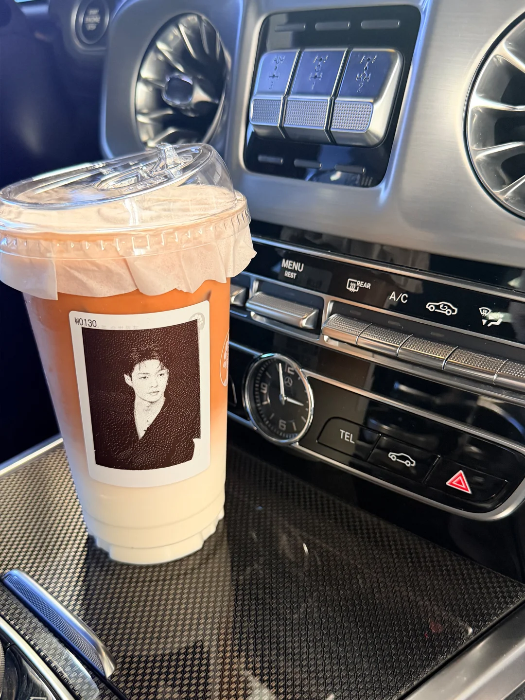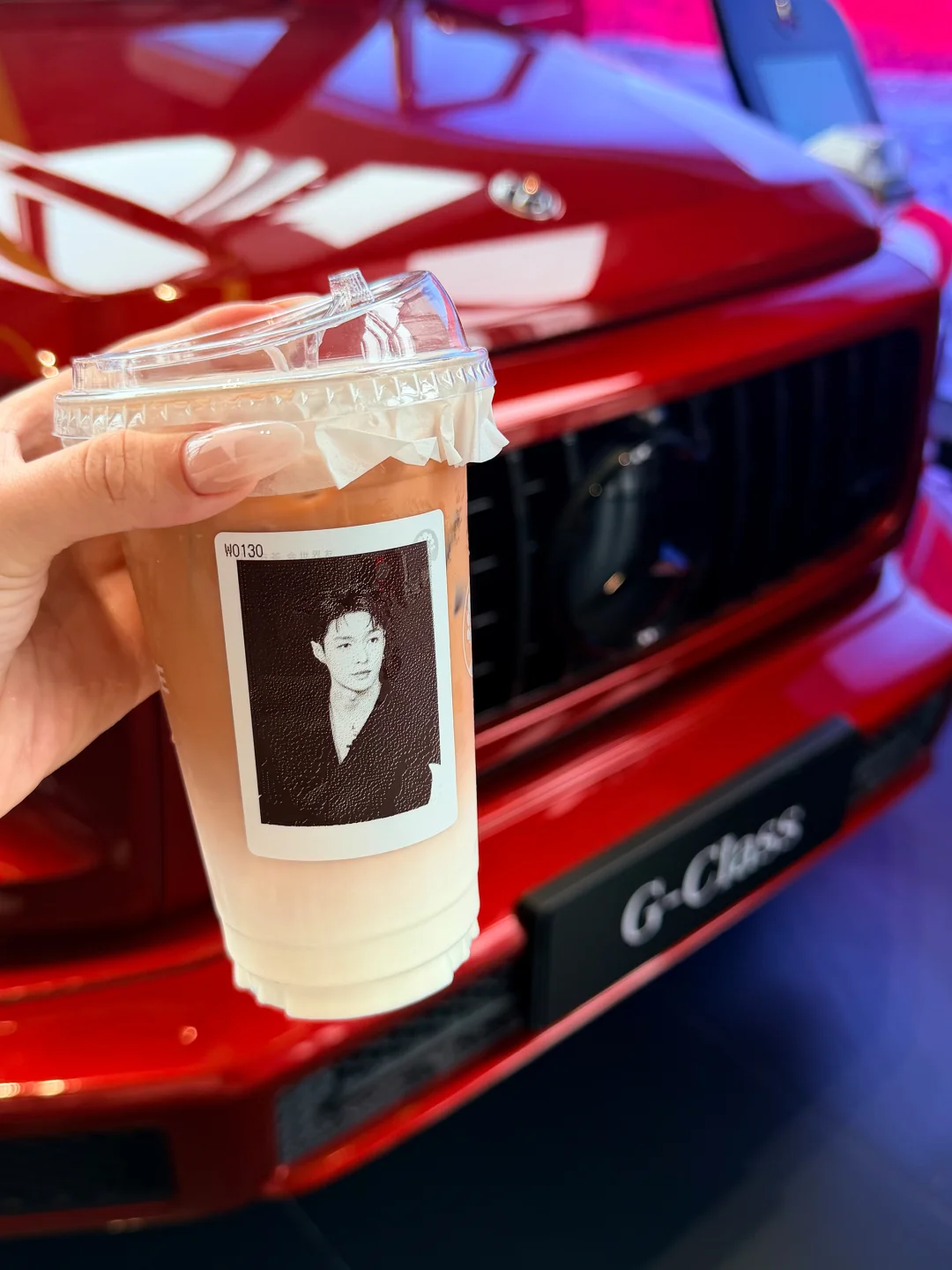 坐大G里,喝品牌大使【张艺兴】杯贴的奶茶