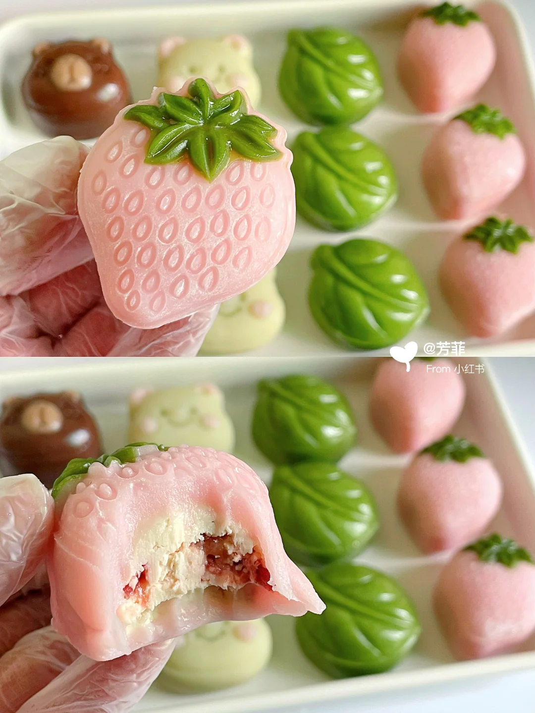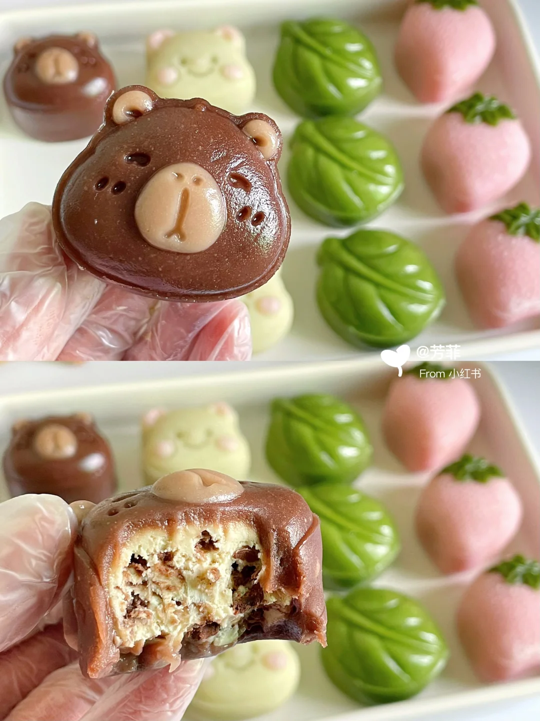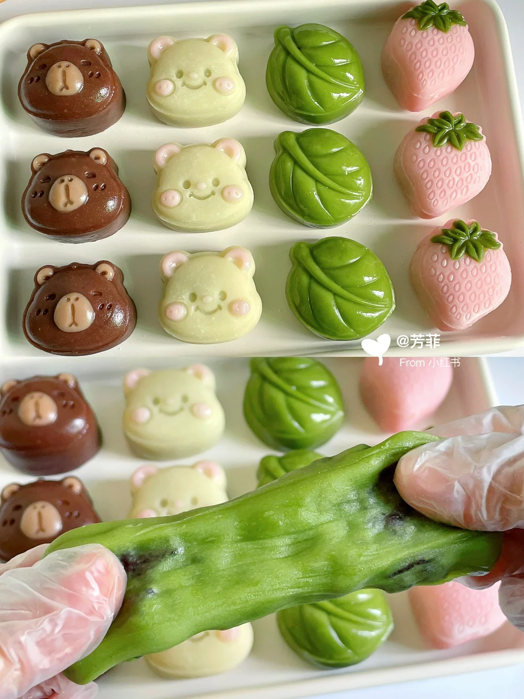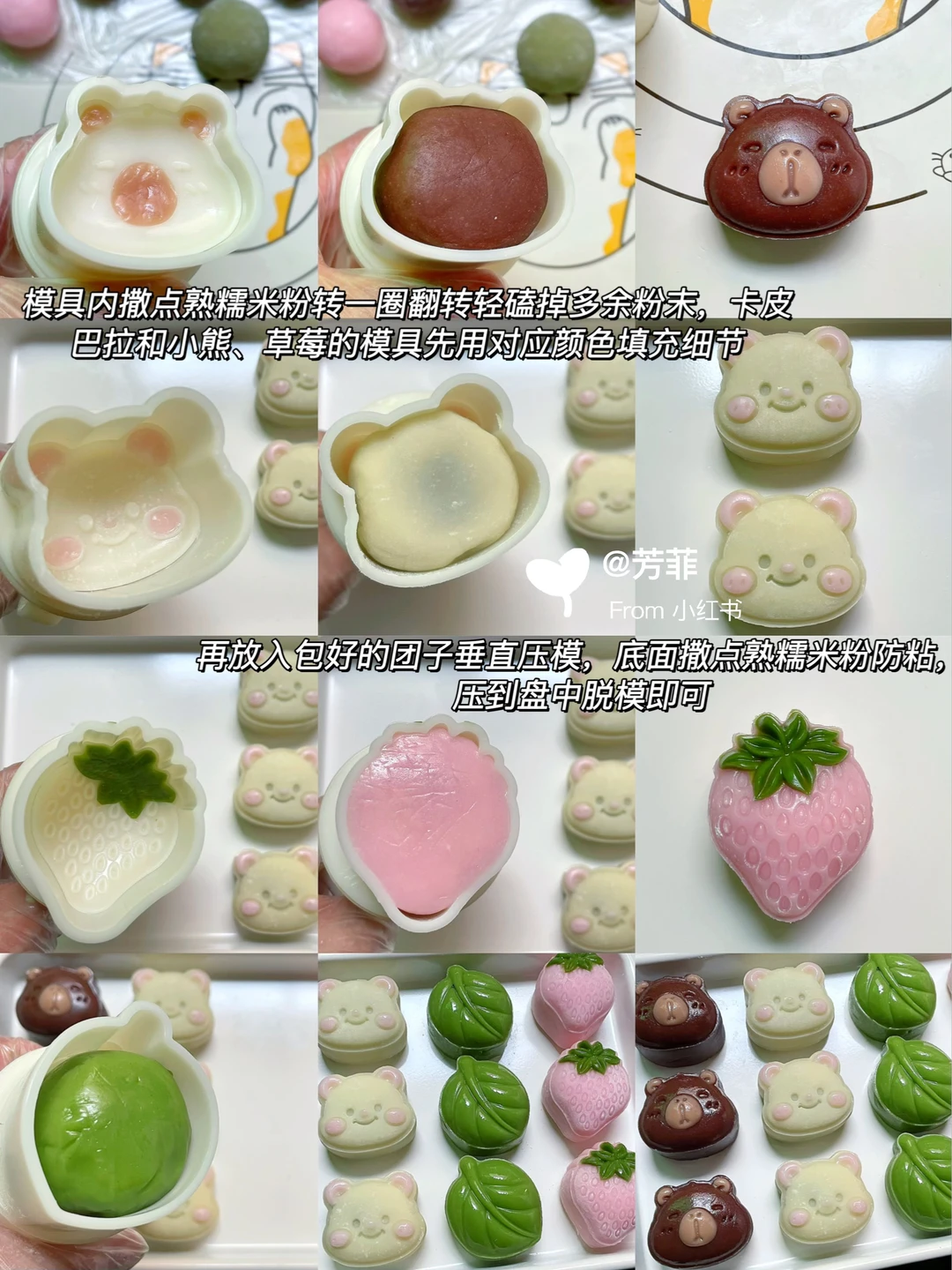 6️⃣模具先撒点熟糯米粉转一圈翻转轻磕掉多余粉末,再做造型.卡皮巴拉先用浅棕填充耳朵鼻子,再放入棕色团子压出立体形状;小熊用浅粉色填充耳朵腮红,再放入浅黄色团子压出小熊形状;草莓先用绿色填充叶子再放粉色团子压出草莓形状,叶子直接压模~