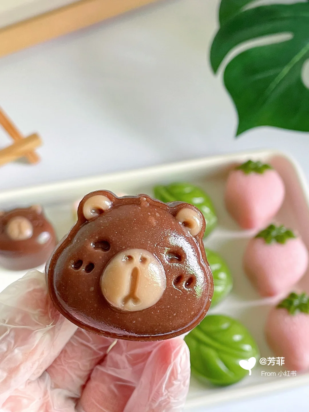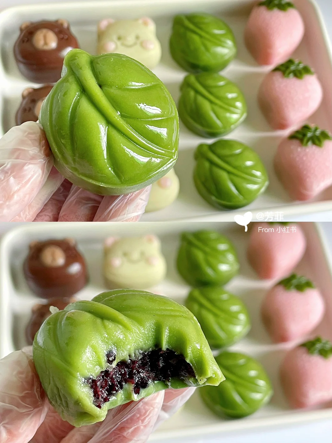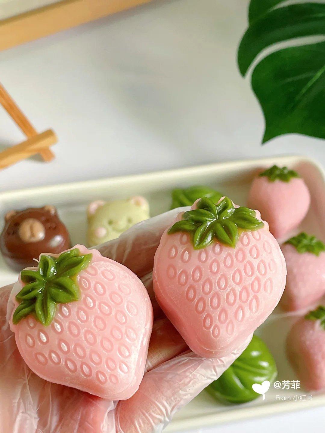 6️⃣模具先撒点熟糯米粉转一圈翻转轻磕掉多余粉末,再做造型.卡皮巴拉先用浅棕填充耳朵鼻子,再放入棕色团子压出立体形状;小熊用浅粉色填充耳朵腮红,再放入浅黄色团子压出小熊形状;草莓先用绿色填充叶子再放粉色团子压出草莓形状,叶子直接压模~