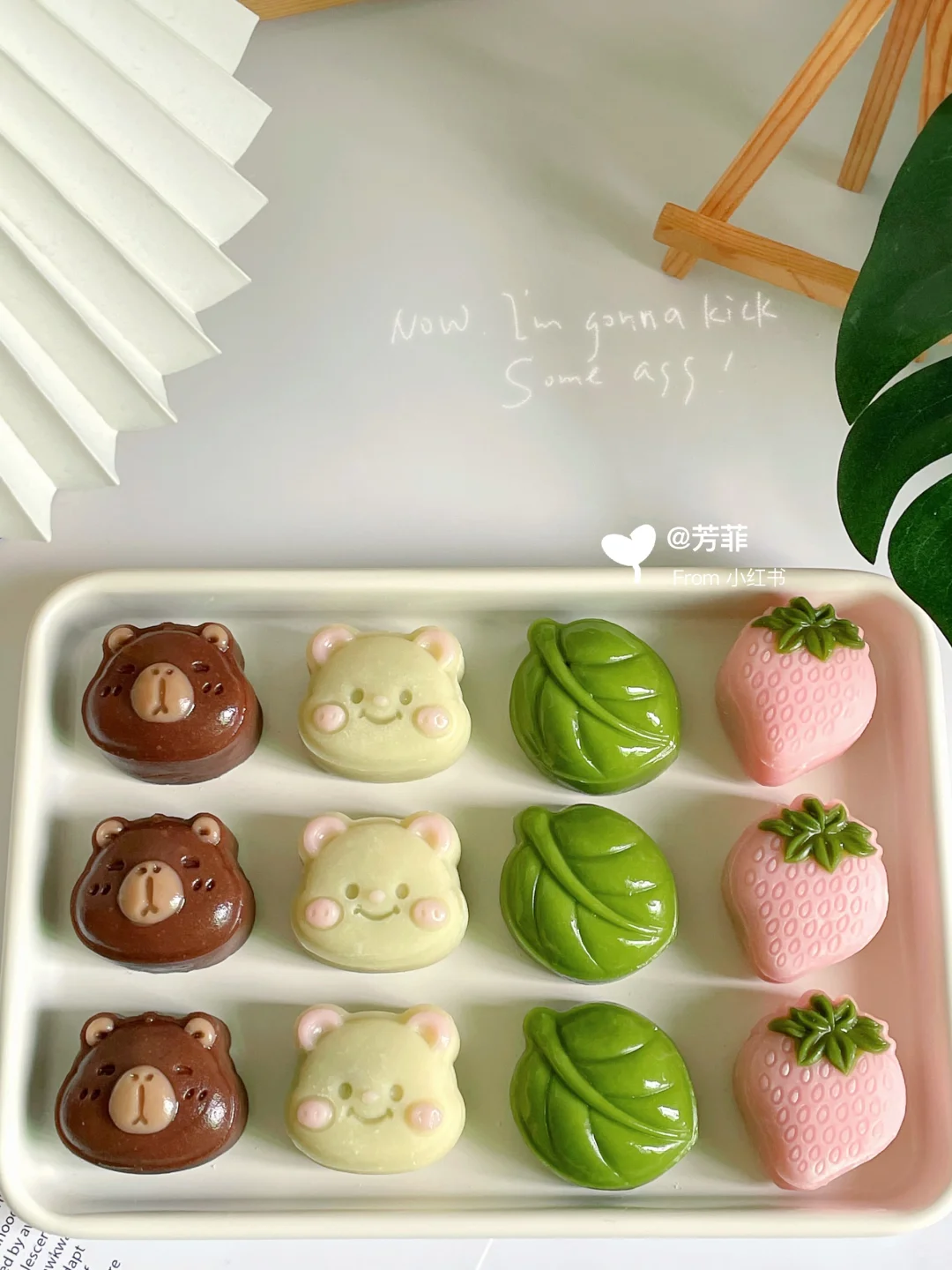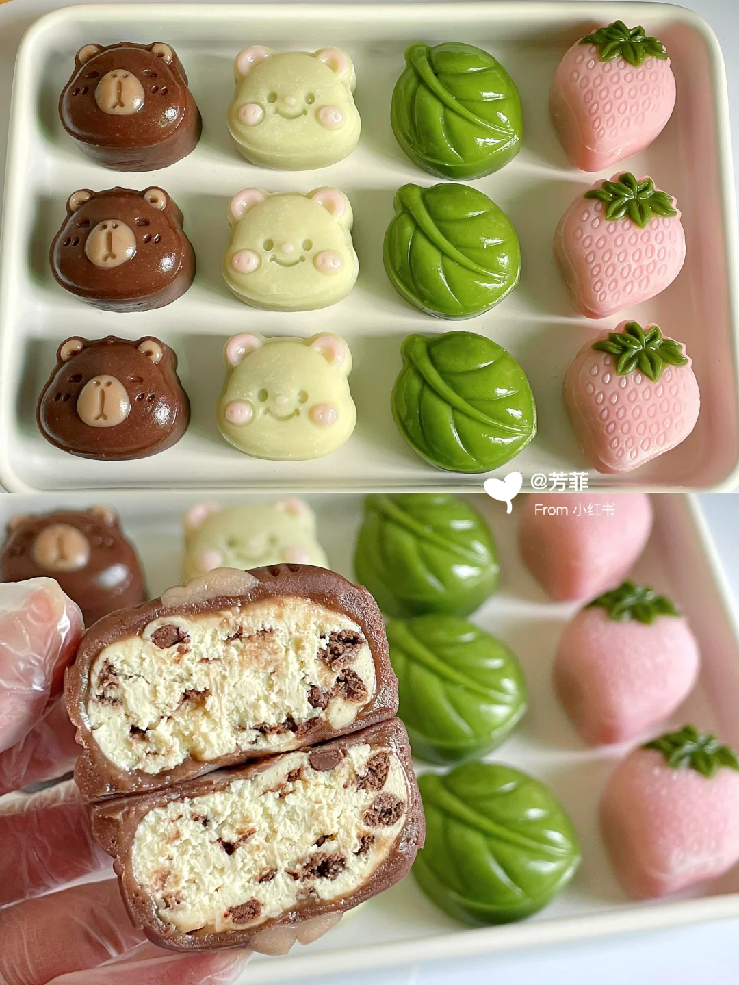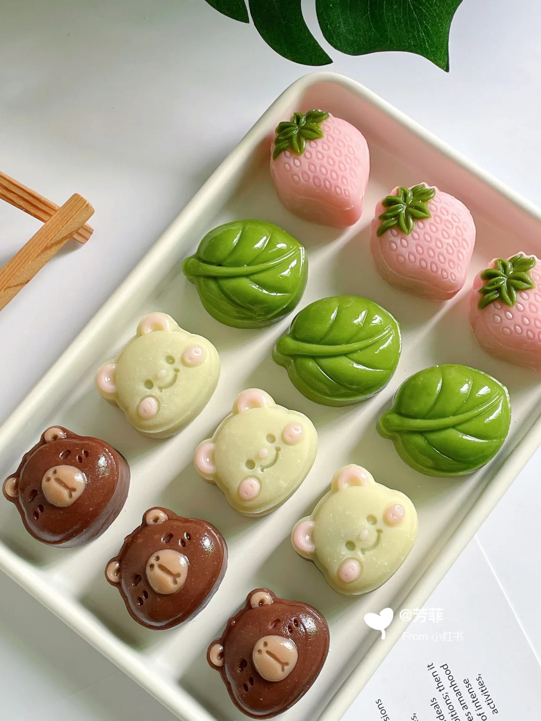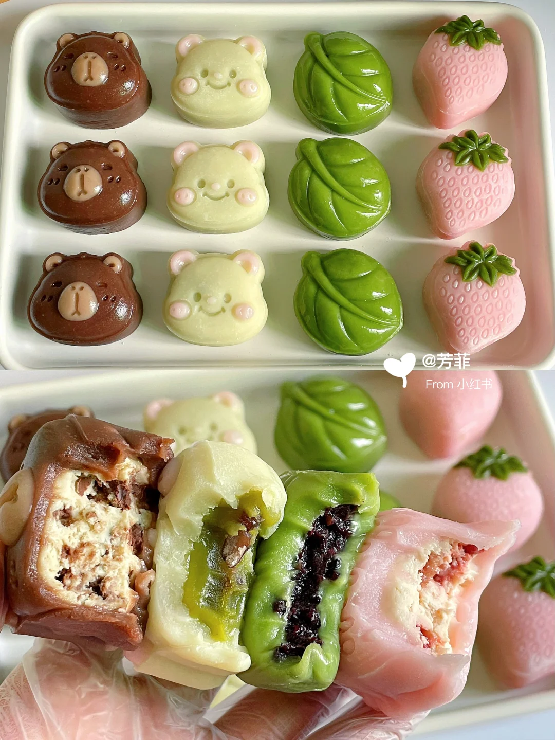 6️⃣模具先撒点熟糯米粉转一圈翻转轻磕掉多余粉末,再做造型.卡皮巴拉先用浅棕填充耳朵鼻子,再放入棕色团子压出立体形状;小熊用浅粉色填充耳朵腮红,再放入浅黄色团子压出小熊形状;草莓先用绿色填充叶子再放粉色团子压出草莓形状,叶子直接压模~