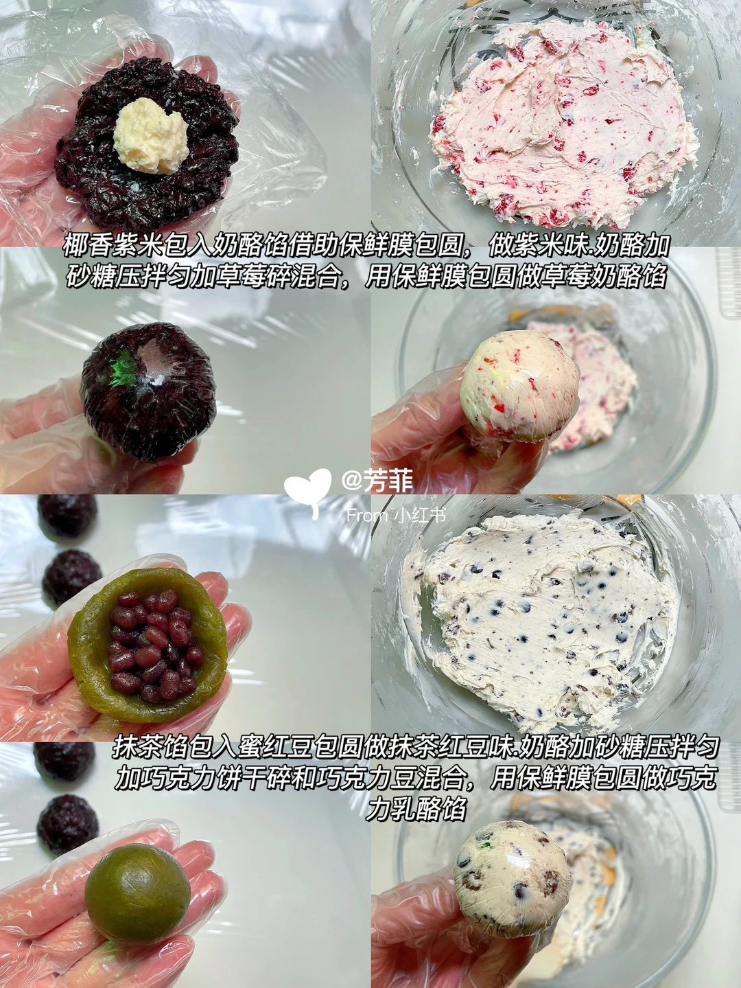 1️⃣准备好食材,紫米煮熟趁热加点椰子油和砂糖、淡奶油混合成椰香紫米馅,冷却后分成20克一个包入5克奶酪馅揉圆.抹茶馅分20克包入5克蜜豆揉圆,奶油奶酪加细砂糖压拌匀,分成两份,一份加冻干草莓碎混合.另一份加巧克力饼干碎和巧克力豆混合,分别分25克一个借助保鲜膜揉圆备用