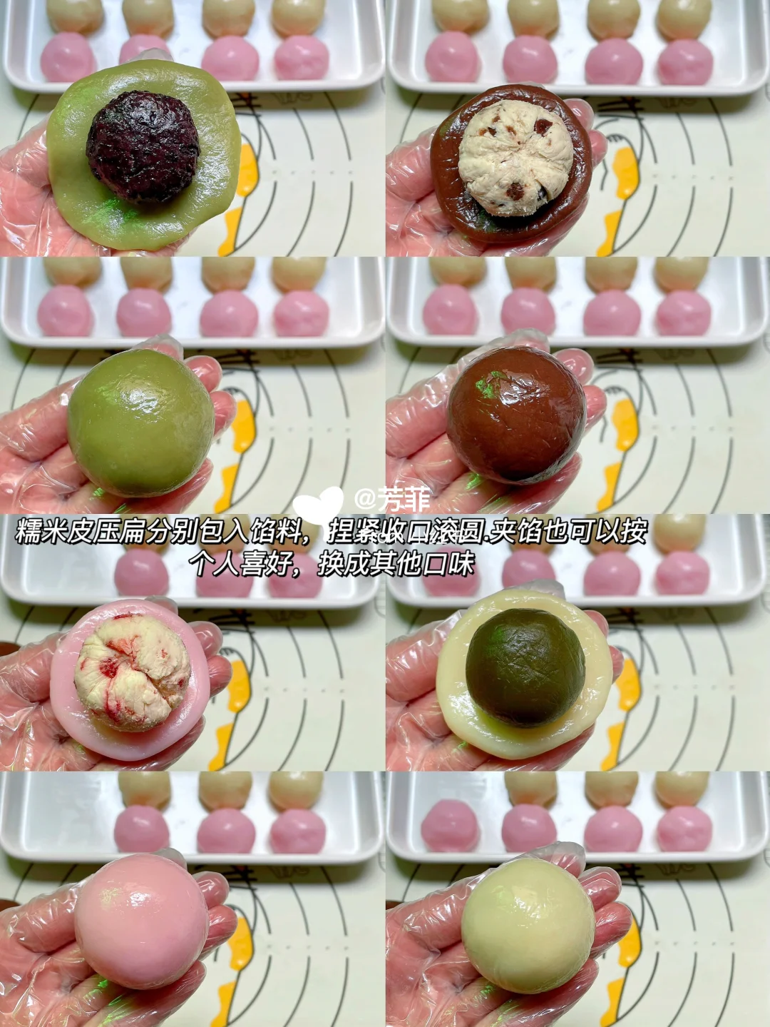 5️⃣团子皮均分成25克一个,馅料均分成25克一个.青团皮包紫米馅,棕色包巧克力乳酪馅、浅黄色包抹茶蜜豆馅、粉色包草莓乳酪馅.分别包圆
