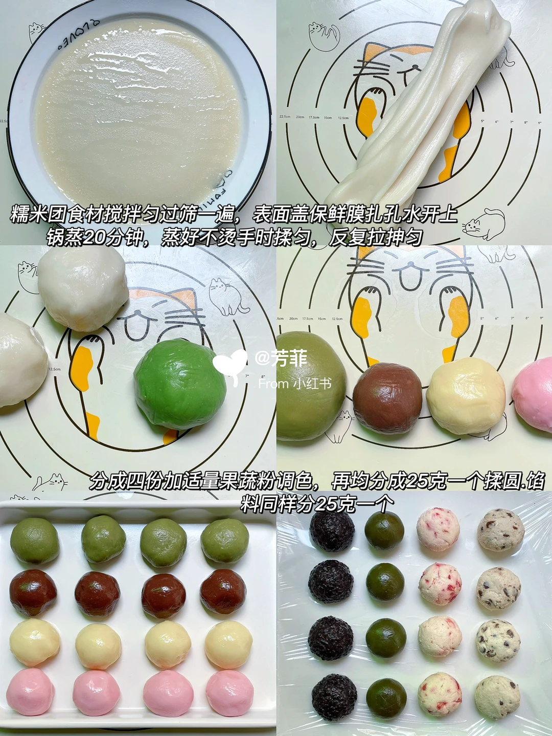 🌱白色团:糯米粉40克 粘米粉30克 澄粉30克 砂糖40克 纯牛奶160~170克 玉米油20克 可可粉/仙人掌果粉/抹茶粉适量