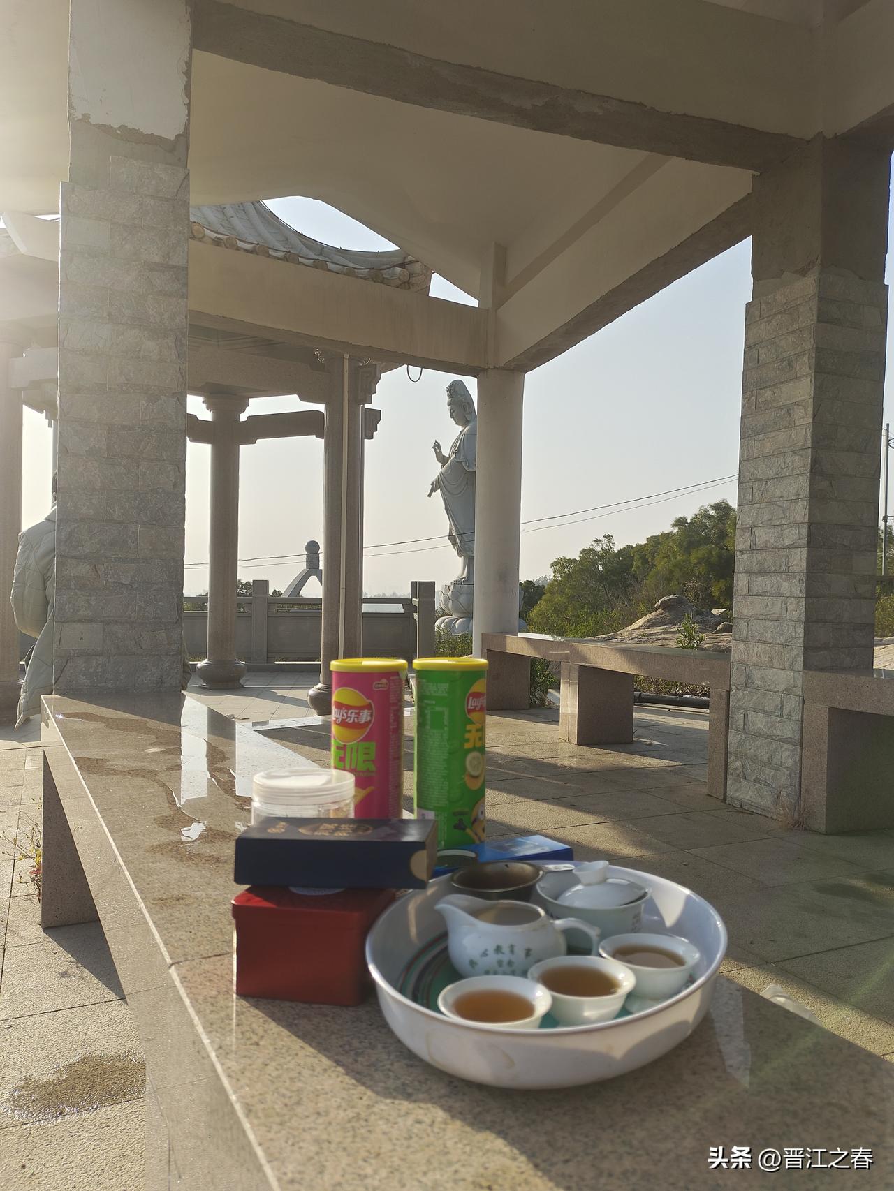 开启自驾游模式,今天晋江英林陈山村大觉山矿山公园。 来陈山大觉山矿坑公园,车是停在马山矿坑公园停车场的。从马山矿坑栈道走到陈山大觉山矿山公园的。 到了山顶,还是老样子泡三杯茶先敬土地公。 陈山的大觉山山脉并不是主峰,但整个晋南依然尽收眼底! 南方阳光下波涛粼粼的是沪厝垵海域。 天气晴朗时,连对岸的金门岛大哥大发射台都看得非常清哳。 微风习习吹来,一边品茶,一边欣赏风景,无比的惬意! 福建省晋江市英林镇陈山大觉山矿山公园是省级国家生态文明试验区项目,总面积790.95亩,总投资2821万元,打造“矿山生态公园+林地储备+文旅产业”综合体,生态修复与休闲旅游功能。