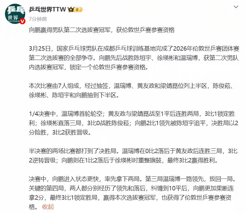 北京时间3月25日,2026年伦敦世乒赛团体赛国乒男队第二次选拔赛在成都乒乓球训练基地落下帷幕。焦点战中,向鹏与温瑞博展开终极对决,最终向鹏以3-1的大比分击败对手,成功斩获本次队内选拔赛冠军,如愿锁定伦敦世乒赛参赛资格;而19岁的温瑞博则继上月选拔赛决赛失利后,再次在关键战中惜败,再度与世乒赛名额擦肩而过。