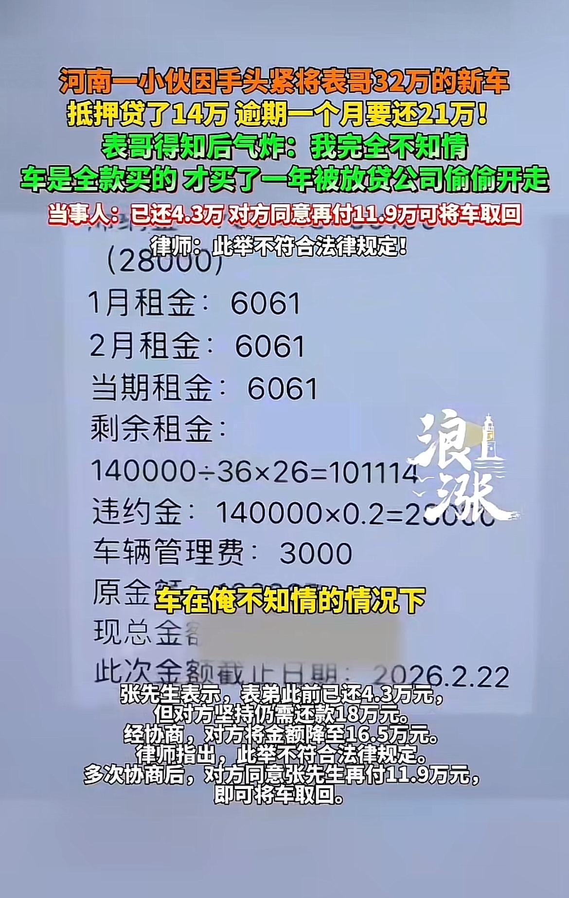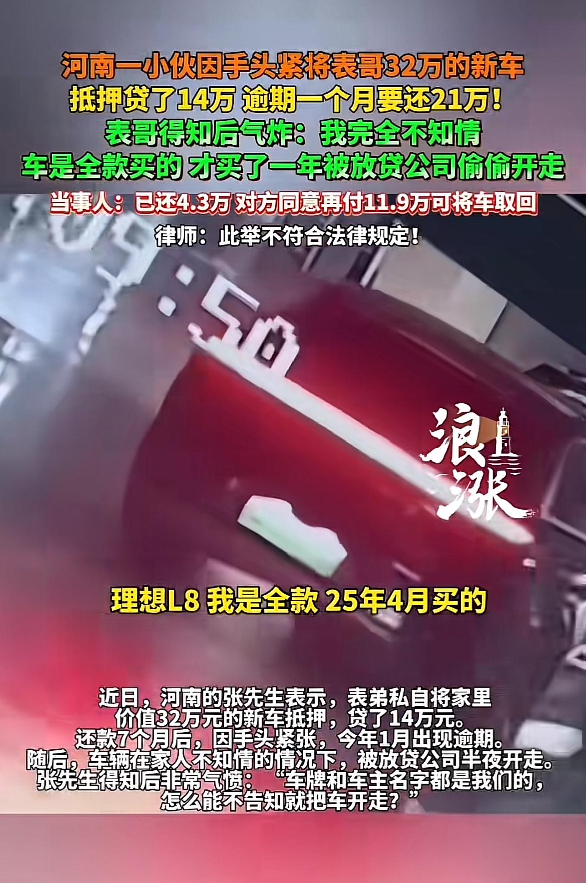 这事儿简直离谱到家了!河南郑州张先生32.68万全款买的理想L8,放表弟名下,结果表弟偷偷抵押贷了14万。还了4万多后逾期一个月,车就被放贷公司开走,赎回竟要再还18万,算下来连本带息要还21万多,年利率高达32.8%,远超国家法律保护上限。 表弟的操作太坑人,放贷公司也够黑,合同不标利率,就等着坑人。好在律师指出民间借贷费用不能超银行利率,超出无效。现在放贷公司虽把还款金额降到16.5万,但这事儿也给大家提了个醒,借钱、抵押都得谨慎,别掉进这种“吃人”陷阱。