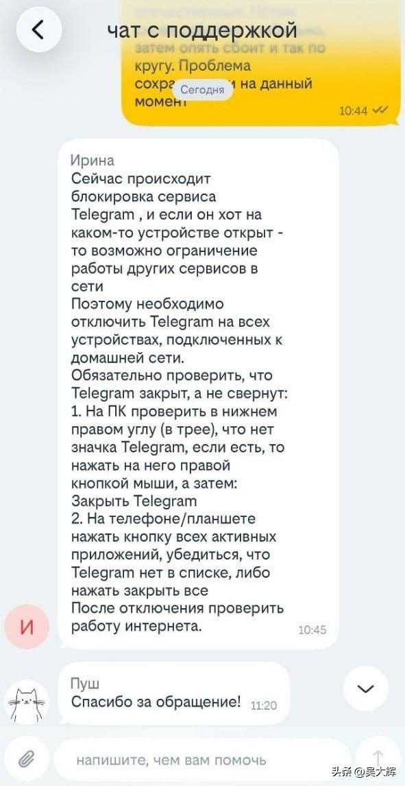 一打开Telegram就断网:运营商开始因这款软件限制网络,却拒不承认? 俄罗斯多地用户出现开启Telegram后网络故障的情况——连接频繁中断甚至彻底断网。 - 具体案例:Beeline(比莱恩)客服直接建议用户在所有设备上关闭Telegram,以恢复其他服务正常使用,而此前该公司刚否认过相关消息(见图1)。 推测原因:网络防火墙将Telegram流量识别为“可疑活动”,进而限制整个网络连接。克拉斯诺达尔边疆区已出现大规模投诉。 - 13:49 官方回应:“消息与事实不符” - 15:19 客服告知:“关闭Telegram或许能解决问题”