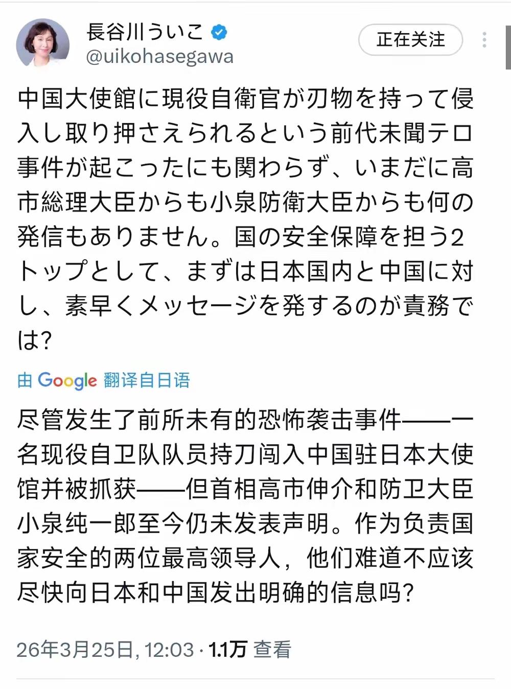 日本政界左翼代表人士长谷川羽衣子今天(3月25日)写道;“尽管发生了现役自卫官携带武器闯入中国大使馆并被制服的前所未有的恐怖袭击事件,但迄今为止,高市首相和小泉防卫大臣仍未发表任何声明。作为肩负国家安全保障的两位高层领导人,难道不应当首先向日本国内和中国迅速传达明确的信息吗?” 这一问,问到了日本政府的痛处。3月24日上午9时许,23岁的日本陆上自卫队三等陆尉村田晃大,手持18厘米长的尖刀,翻墙闯入中国驻日本大使馆,扬言要“以神的名义杀死中国外交人员”。这不是电影情节,是真实发生在东京街头的恶性事件。一个现役军官,带着凶器,闯入他国大使馆,这在现代国际关系史上都极其罕见。 中国外交部第一时间作出反应,发言人林剑连续两天在记者会上严正表态,要求日方彻查、严惩、给中方一个负责任的交代。中方指出,这起事件严重违反《维也纳外交关系公约》,日方未能履行保护外国使领馆安全的国际法义务。可日本这边呢?高市早苗首相沉默至今,小泉进次郎防卫大臣也一言不发,只剩内阁官房长官木原稔轻描淡写地说了句“深感遗憾”。 这种沉默,让日本国内的有识之士都看不下去了。法政大学教授河野有理直言这是“毫无辩解余地的重大失态”,自卫队的组织责任难以免除。同为法政大学教授的白鸟浩警告,如果日本政府仅以“遗憾”了事,今后日本外交人员在海外遇到类似事件时,将无法要求他国作出充分道歉。历史学者山崎雅弘更是直接质问:作为自卫队最高指挥官的高市首相,难道不应该作出说明吗? 日本网民的反应也相当激烈。在日本雅虎新闻评论区,近2000条留言中,大量声音表达了对政府沉默的不满和对事态升级的担忧。有日本网友一针见血地指出,由于政府和媒体长期煽动反华情绪,出现这样的人只是时间问题。还有网友认为,这是反华教育煽动对立的恶果。这些声音说明,日本老百姓心里跟明镜似的,知道问题的根子在哪。 长谷川羽衣子的批评,戳破了一个尴尬的事实:日本政府高层似乎根本没把这起事件当回事。一个现役自卫官持刀闯入中国大使馆,威胁要杀人,这样的“恐怖袭击”居然换不来首相和防卫大臣的一句公开表态。这不禁让人想问:高市早苗到底在想什么?小泉进次郎又在躲什么? 答案或许藏在日本政府最近的一系列动作里。就在事发后不到24小时,日媒曝出2026年版《外交蓝皮书》草案,日方拟将中日关系从“最重要的双边关系之一”降级为“重要邻国”。台湾问题的表述也被升级,试图将中国内政国际化。一边是沉默以对,一边是暗中升级对抗,这哪里是处理危机的态度,分明是在火上浇油。 更让人警惕的是,高市早苗上台以来,一直在推动修宪扩军,打破“专守防卫”原则,甚至公然宣称“台湾有事”构成日本“存亡危机事态”。这种极右翼言论和政策,直接毒化了两国民意氛围,让日本国内的反华情绪不断升温。村田晃大这样的极端分子,就是在这样的政治土壤里长出来的。中国外交部说得很清楚,这起事件暴露了日本政府对自卫队人员失管失教,对历史、台湾等问题的错误政策流毒深重。 国际社会都在看日本怎么做。一个23岁的现役军官,带着刀翻墙闯进中国大使馆,这不是个人能独立完成的疯狂。他前一天就从宫崎县驻地乘新干线赶到东京,在网吧潜伏一夜,第二天一早买刀作案。这样的行为,背后有没有组织支持?他的极端思想是怎么形成的?日本政府不彻查、不交代,恐怕说不过去。 中方的态度非常明确:日方必须立即彻查事件,严惩不法分子,切实保障中国驻日使领馆和外交人员的安全。这不是中国在找茬,是日本必须履行的国际法义务。《维也纳外交关系公约》白纸黑字写着,接受国有责任保护外国使馆免受侵入和损害。高市早苗可以沉默,但国际法不会沉默,历史也不会沉默。 日本有识之士的追问,值得每一位关心中日关系的人深思。当肩负国家安全保障的领导人选择沉默,当现役军官持刀闯入他国使馆却无人问责,日本到底要把自己推向何方?中日关系的未来,不该被极右翼的疯狂绑架,更不该被政客的沉默埋葬。 麻烦看官老爷们右上角点击一下“关注”,既方便您进行讨论和分享,又能给您带来不一样的参与感,感谢您的支持! 各位读者你们怎么看?欢迎在评论区讨论。