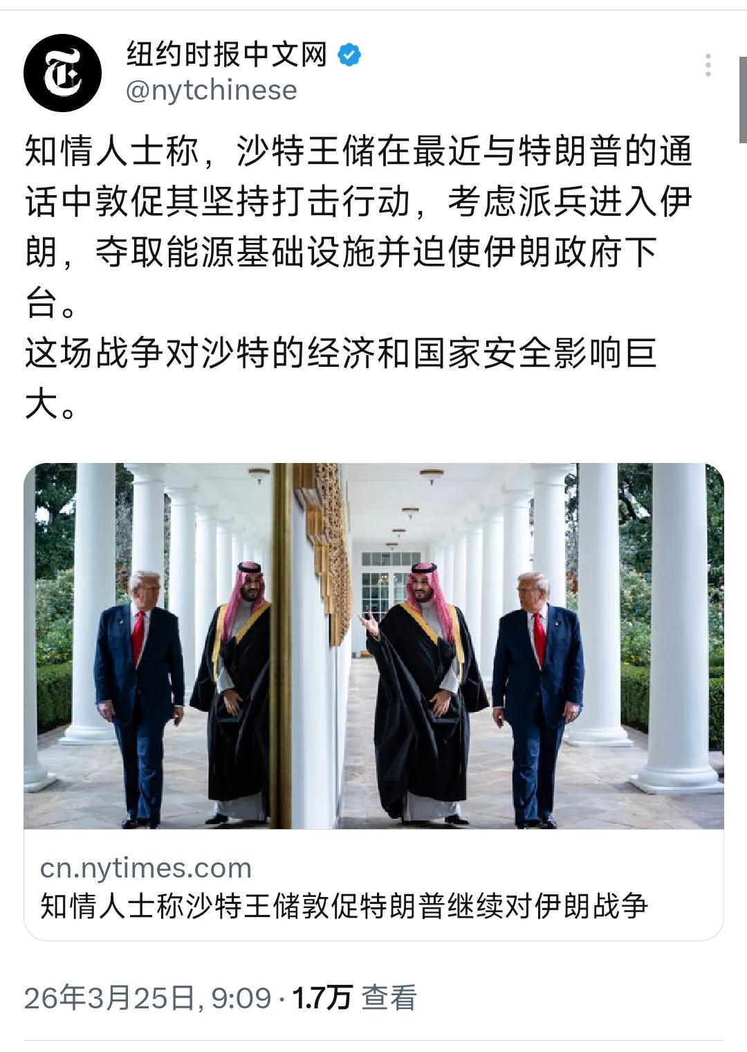 《纽约时报》中文网今天(3月25日)报道:“知情人士称,沙特王储在最近与特朗普的通话中敦促其坚持打击行动,考虑派兵进入伊朗,夺取能源基础设施并迫使伊朗政府下台。这场战争对沙特的经济和国家安全影响巨大。” 与其说知情人士称,倒不如说美国在离间中东,美以开战前,该报曾称沙特王储访美,说服美方必须军事打击伊朗,后遭到否认。作为中东老大的沙特,目前处于尴尬境地,没想到美国被以色列轻松拉下水,也没有想到伊朗会如此强烈的反击,包括对设有美国军事基地的中东国家。美国自然希望沙特等国加入到对伊朗的军事行动中去,结局是中东再无宁日,但这是美方最希望看到的局面,中东的王爷们也不傻,一再对伊朗的行动保持克制。