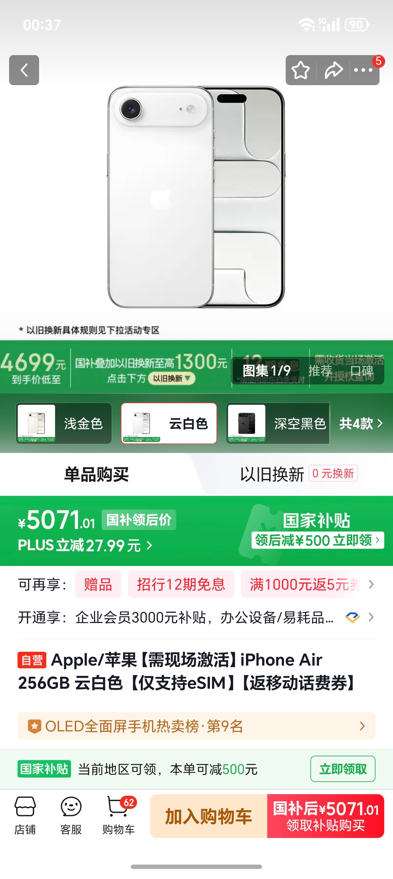 iPhone Air在狗东上如果选择以旧换新和国补的话,最低4699就可以买到256g版本了