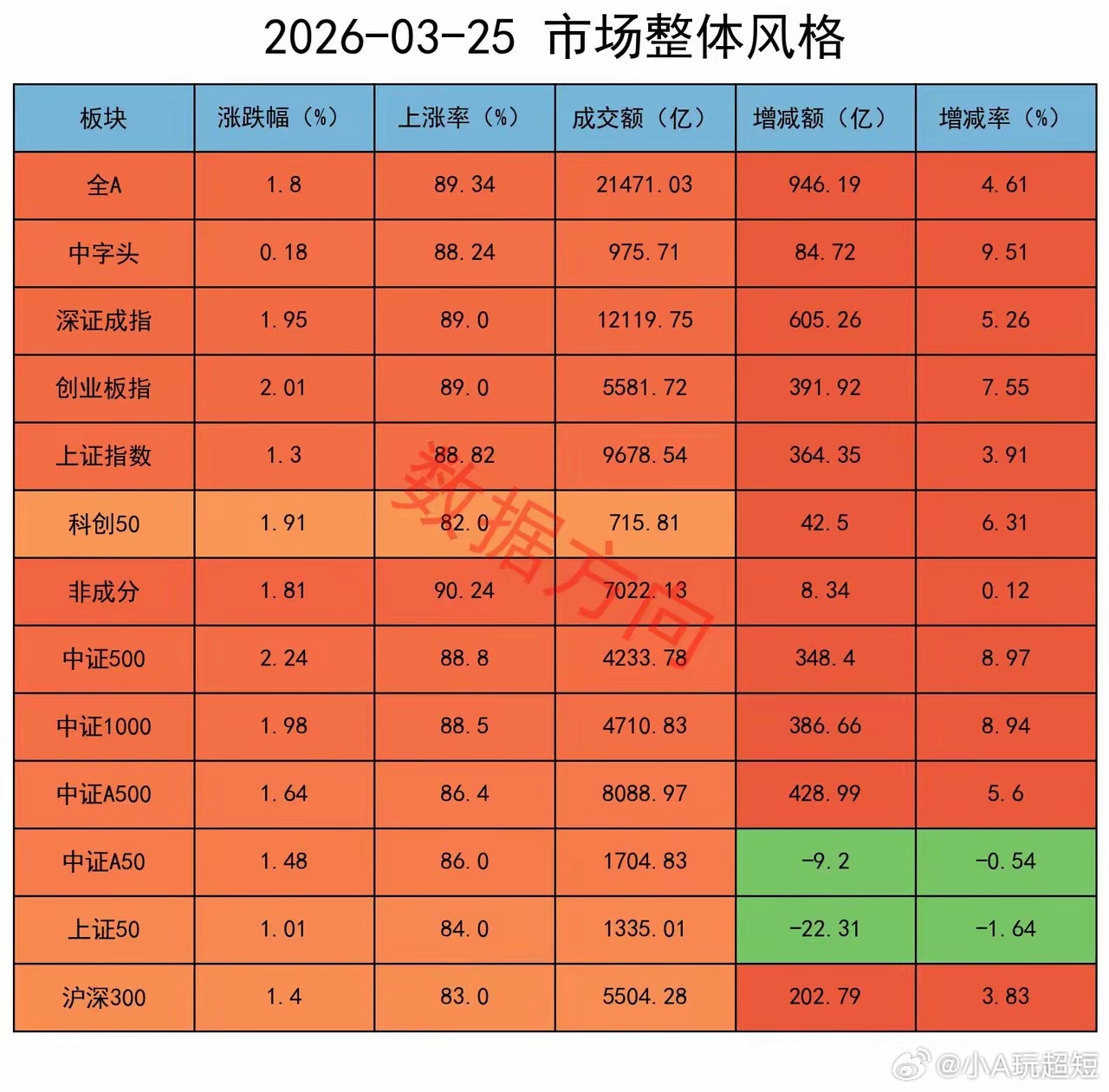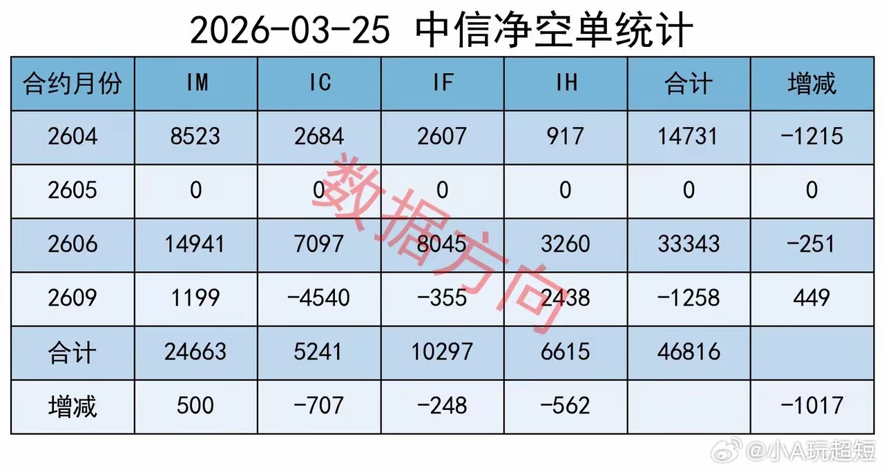 上证收复3900点,继续减空大盘全天高开高走,全A指数涨幅1.8%,算电协同、有色金属都有不错表现,行业板块几乎全线上涨,个股上涨率89%,成交额较昨天放大5%。所有指数都上涨,成分股的上涨率都在80%以上。中小盘股、科技品种更活跃一些。中证500、中证1000的涨幅分别为2.24%、1.98%,创业板指、科创50的涨幅分别为2.01%、1.91%。这两天都属于报复性反弹,普涨、并且缺少结构。从复盘数据来看,继续采取了减空的操作。行业除了煤炭、石油石化两个行业下跌以外,其他29个申万一级行业全部上涨。已经连续第二天出现这种情况。中东局势出现缓和信号。据报道,来自土耳其、埃及和巴基斯坦的调解人正努力在未来48小时内安排美伊官员会晤,尽管双方立场仍相距甚远。特朗普单方面宣布“美伊接触”和“获得胜利”,不一定有多高的可信度,但确实发挥了作用,国际油价已经从最高的119美元,回落到目前的87美元。一位股民的留言获得高赞。他表示,战争刚开始的时候,一心希望伊朗能挺住、甚至能够获得最终的胜利,现在只希望战争能早点结束,实在是亏得太难受了。这种想法应该代表了很多人的心声。通信,涨幅3.71%,在所有行业中涨幅最大,以及近期涨得比较好的电力1层在23日表示,下一步将会同相关部门大力推进算电协同工程,确保枢纽节点新建算力设施绿电应用占比达到80%以上,最大程度发挥绿色电力的支撑作用。算电协同是指通过数字化技术、智能算法、信息网络,将算力基础设施与电力系统进行深度融合,推动资源动态匹配与优化配置的新基建工程,实现“以电强算、以算促电的良性循环”。热力图此图用于观察市场整体强度结构。煤炭(98)、公用事业(94)、石油石化(91)、通信(90)、电力设备(88),是当前最强的5个行业,目测就是“能源 + 算电协同”。相比之下,煤炭、石油石化受中东局势的影响较大,算电协同更符合市场的自主选择。期指持仓某信,减空1017手;对IM加空500手,分别对IH、IF、IC减空562手、248手、707手;平仓买单8526手,平仓卖单9543手。其他主要玩家,加空653手;分别对IH、IC加空638手、998手,分别对IF、IM减空618手、365手;平仓买单27789手,平仓卖单27136手。大盘高开高走、放量上涨,沪指收复3900点,个股普涨。两者合计减空364手,至少不是坏事。只不过力度太小,说明在缺口这里,追高的意愿有所下降。合计对IH、IF减空790手,合计对 IC、IM加空426手。操作完成后,共持有净空单115694手。某队减持8000以后,净空单一度飙升至16.5万手,数据方向第一时间强调要仓控。前天大盘全线重挫,市场一片哀鸣。当天,数据方向告诉大家,另一个指标已经到位,等主力进场就差不多了。一高一低,两个时间节点都比较准确。比较可惜的是,周一晚上,特朗普宣布了“利好”,结果大盘第二天直接高开高走,连续两天普涨。如果那天懂王没有多一嘴,任凭我A自由发挥,把恐慌盘洗出来,并且继续减空一、两万手,效果会更好。这里不能太空。如果有二次回踩,仍然可以加码。股指期货