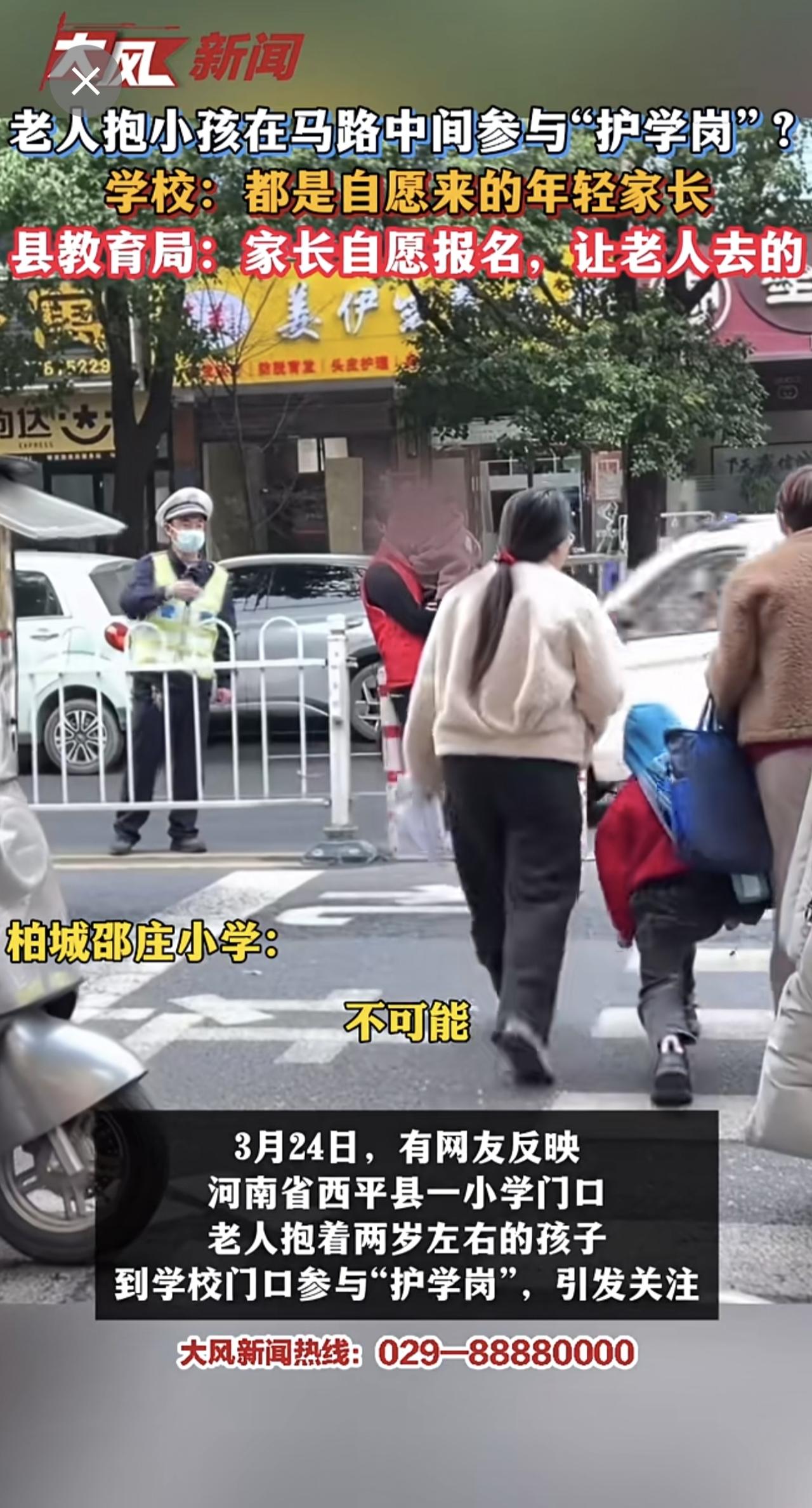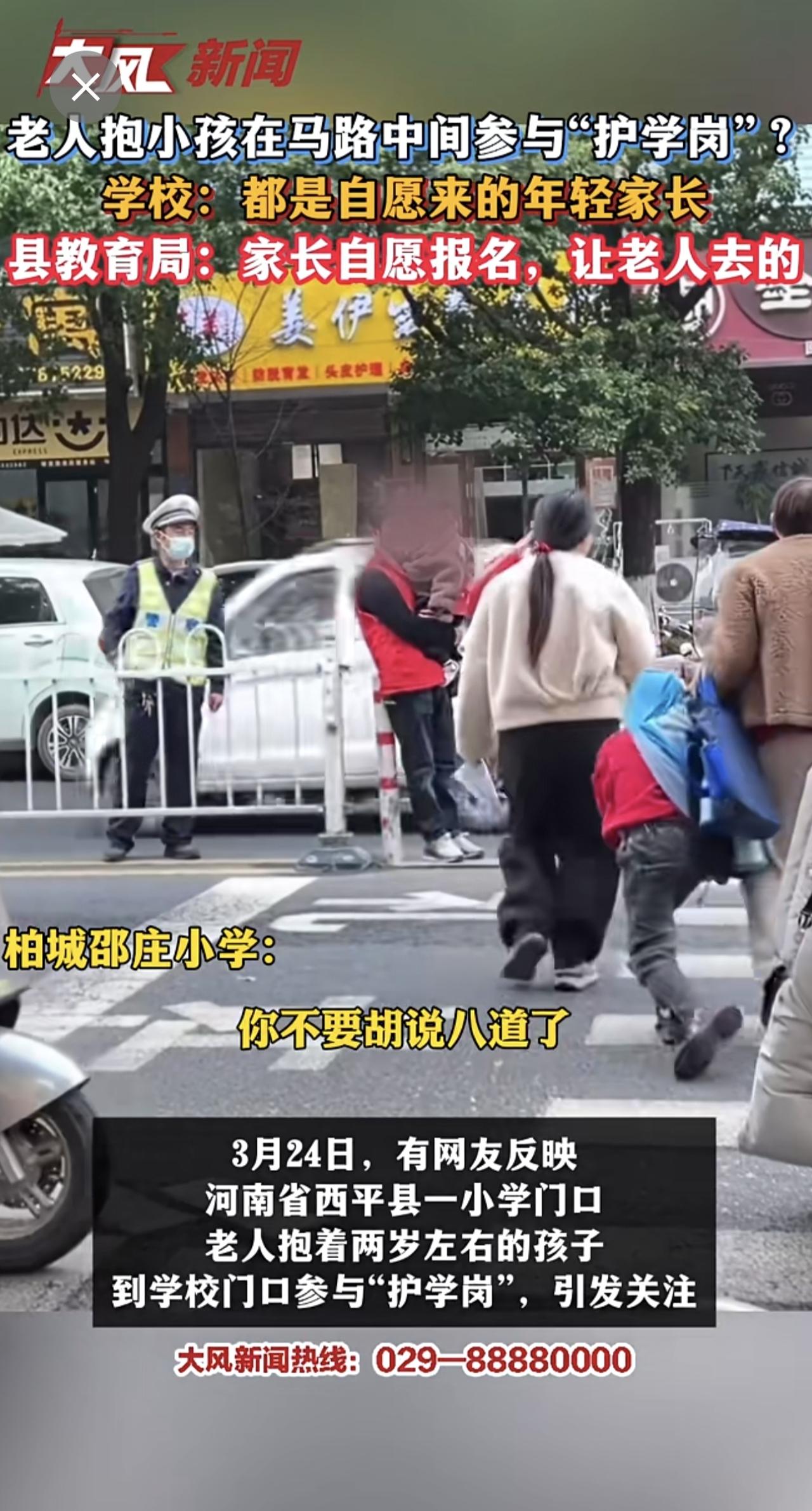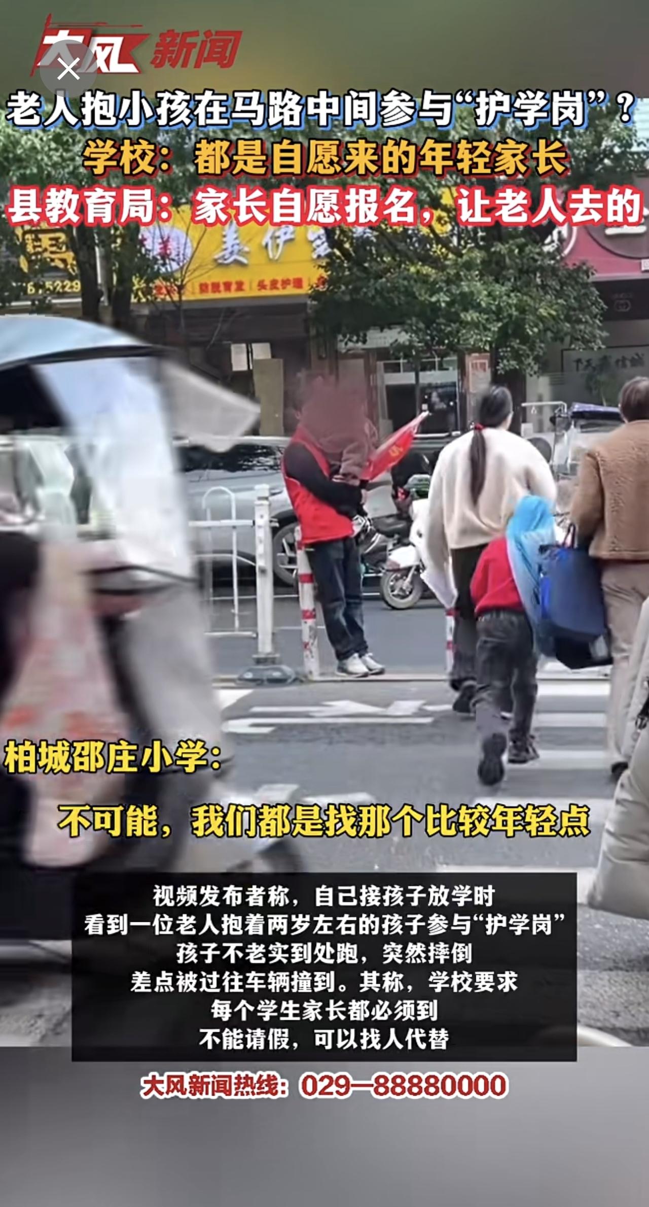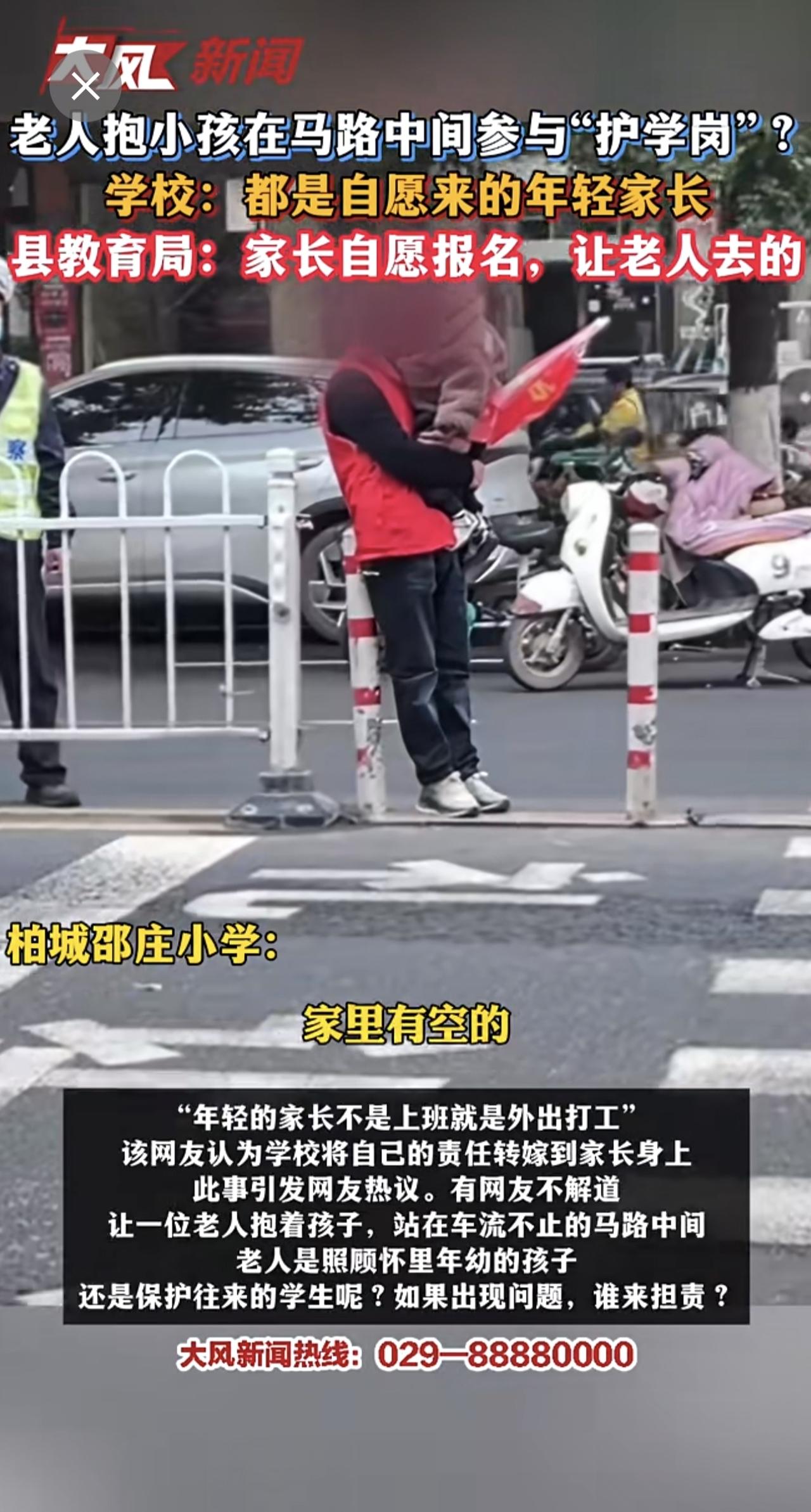 老人抱小孩在马路中间参与“护学岗”?学校:都是自愿来的年轻家长 县教育局:家长自愿报名,让老人去的