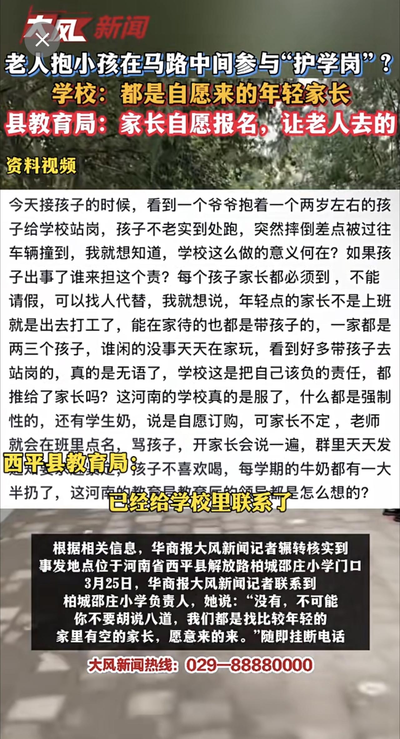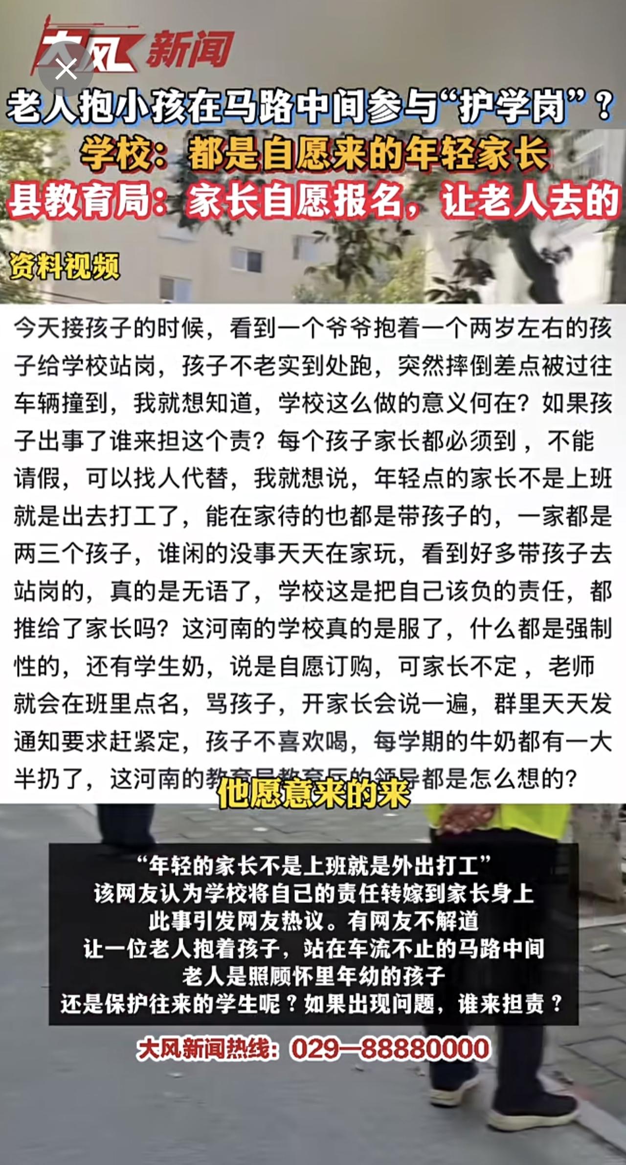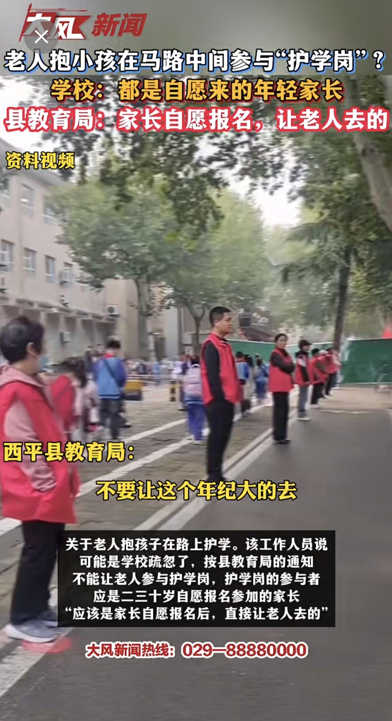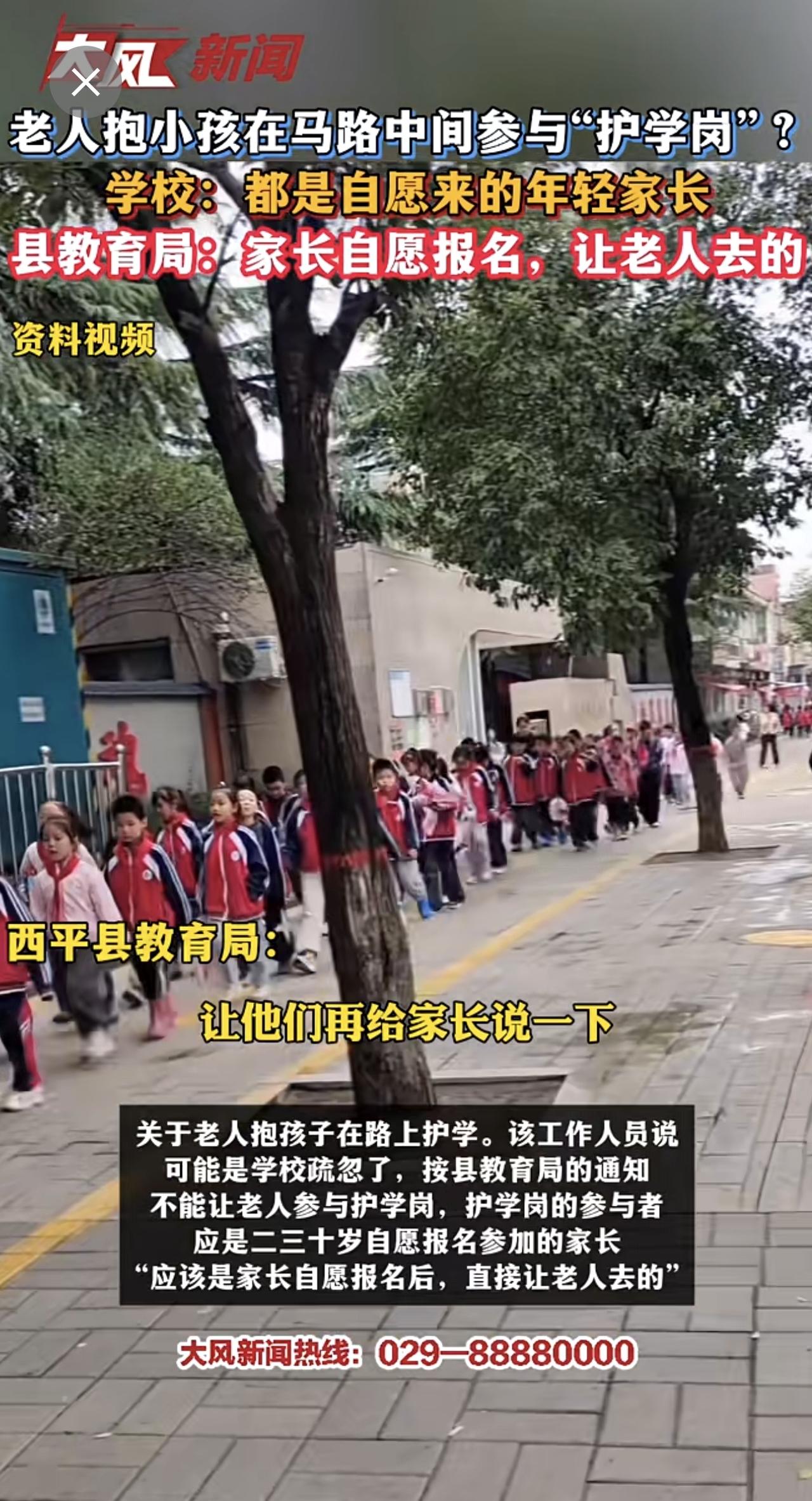 老人抱小孩在马路中间参与“护学岗”?学校:都是自愿来的年轻家长 县教育局:家长自愿报名,让老人去的