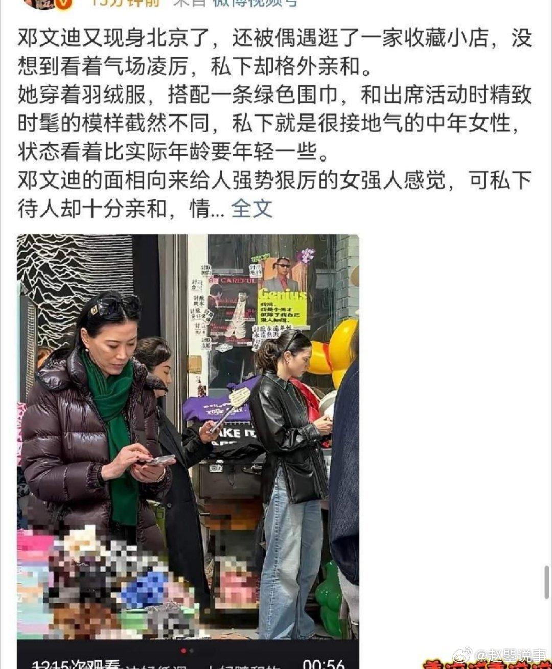 从商业舞台上的“狠角色”,到收藏小店的“随和顾客”,邓文迪就像一本充满反转的书,你以为读透了她的强势,却又在某个街角,撞见她接地气的另一面,这大概就是她最迷人的地方吧。3月22日深夜,“百亿大佬”邓文迪,连夜冲上了高位热搜,谁也没想到,她居然被扒出了一张照片,有网友在北京一家收藏小店偶遇了她。