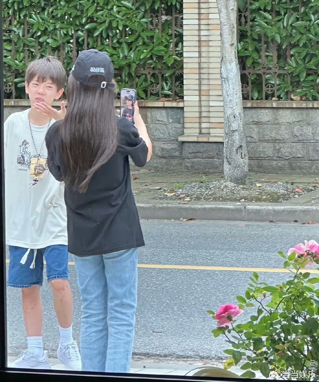 嗯哼,12岁的年纪,身着白色T恤搭配牛仔短裤,个头长高了许多,呈现出一副阳光少年的样子。甜馨身着黑T搭配牛仔裤,她有着长长的头发,头上带着棒球帽,其背影看上去既飒爽又利落,彻底摆脱了小时候的那种奶气。颜值基因大赏