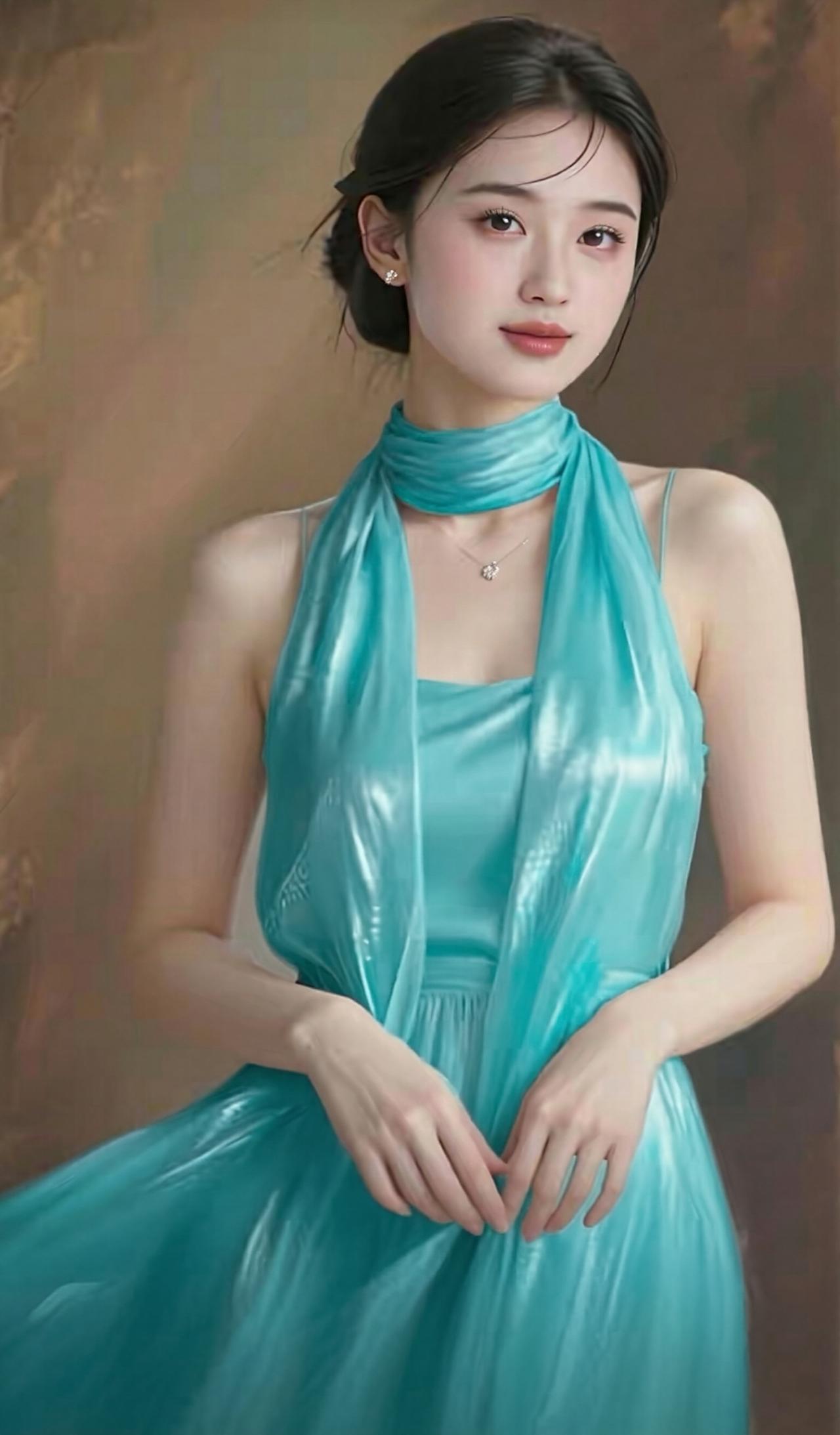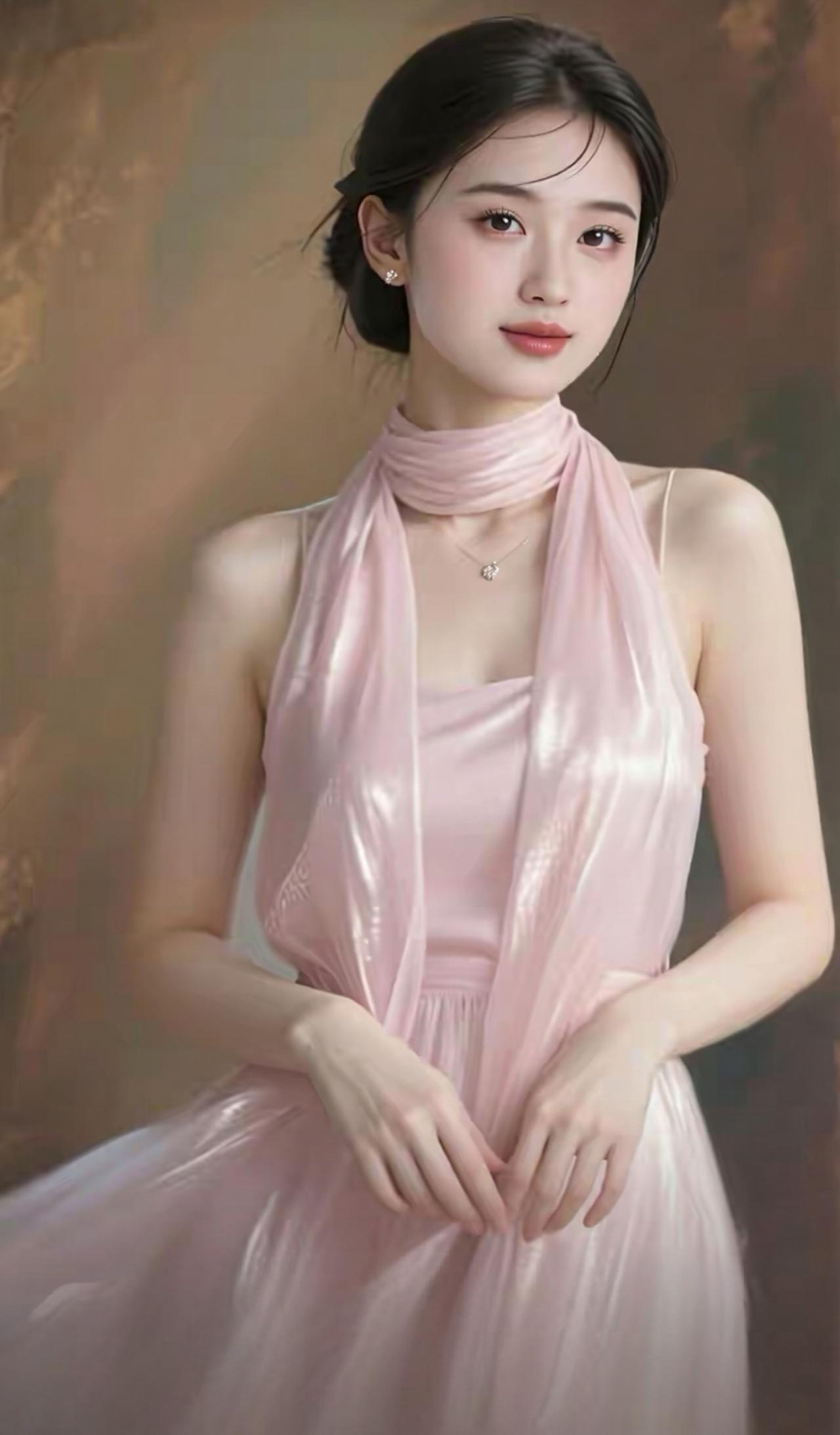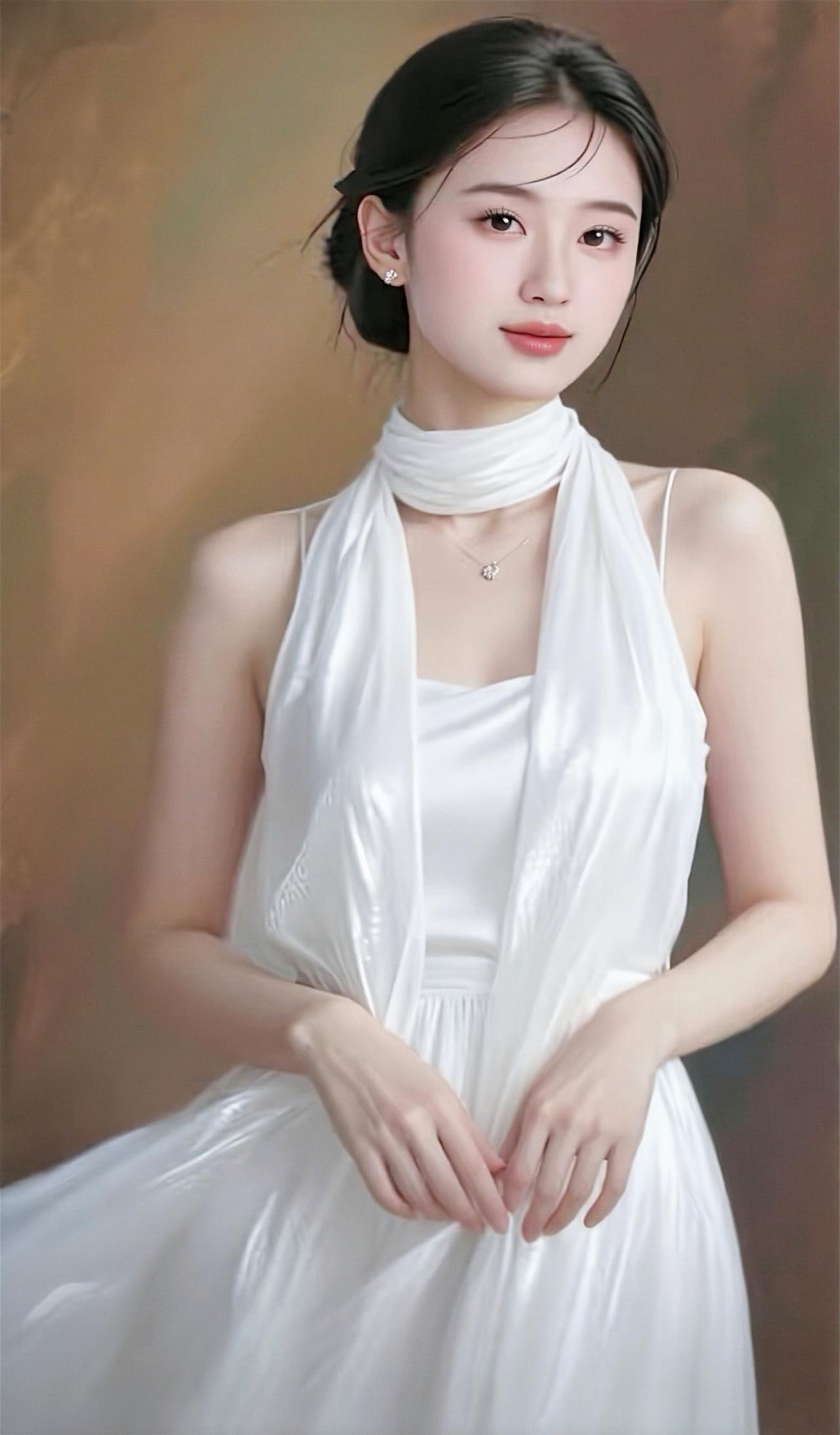 这组照片中的女子气质清冷出尘,宛如古典画卷中走出来的仕女。 她身着一袭挂脖式流光长裙,面料如月光下的湖水般丝滑垂顺,自带细腻光泽。挂脖的设计巧妙地勾勒出优美的天鹅颈与精致锁骨,露出的肩头线条流畅,尽显温婉与性感。 乌黑的秀发被精心盘起,几缕碎发垂落在脸颊旁,增添了几分慵懒与柔媚。她的眉眼如画,眼眸清澈明亮,唇色淡雅,神情恬静淡然,带着一种不食人间烟火的疏离美感。 背景是温润的暖棕色调,光影斑驳,营造出静谧的油画质感。无论是站立还是轻倚,她的姿态都优雅从容,裙摆轻扬,仿佛自带柔光,将东方女性的温婉、灵动与高级感展现得淋漓尽致。
