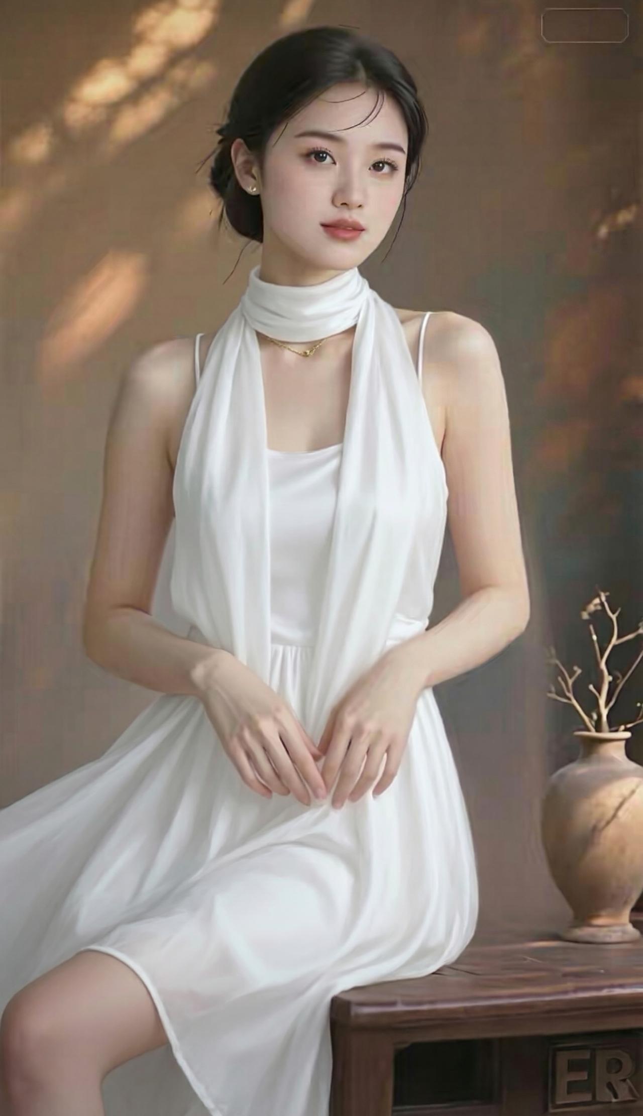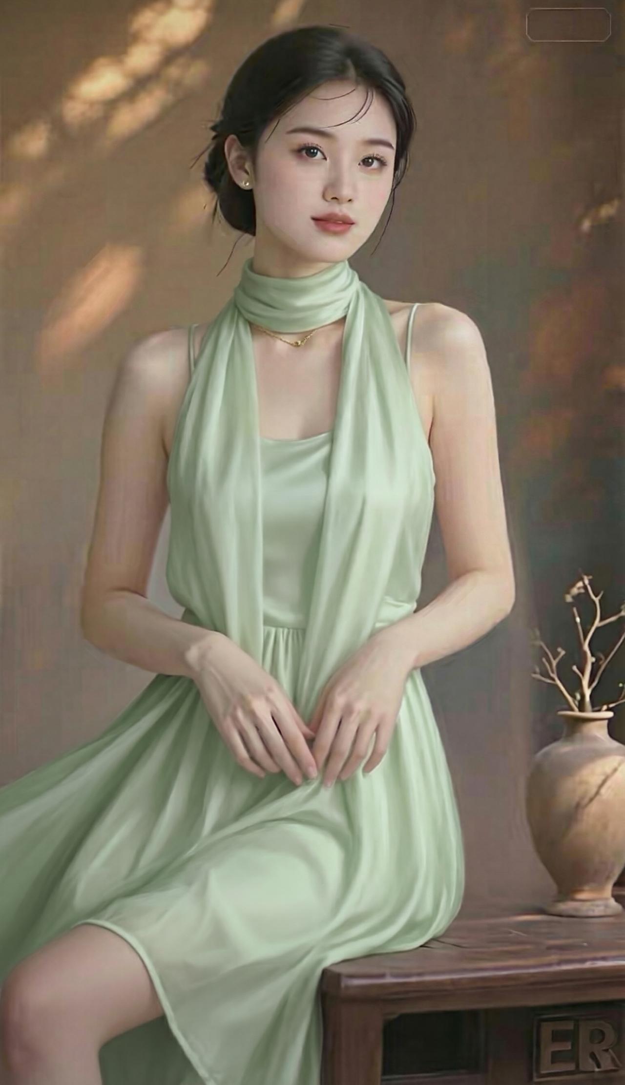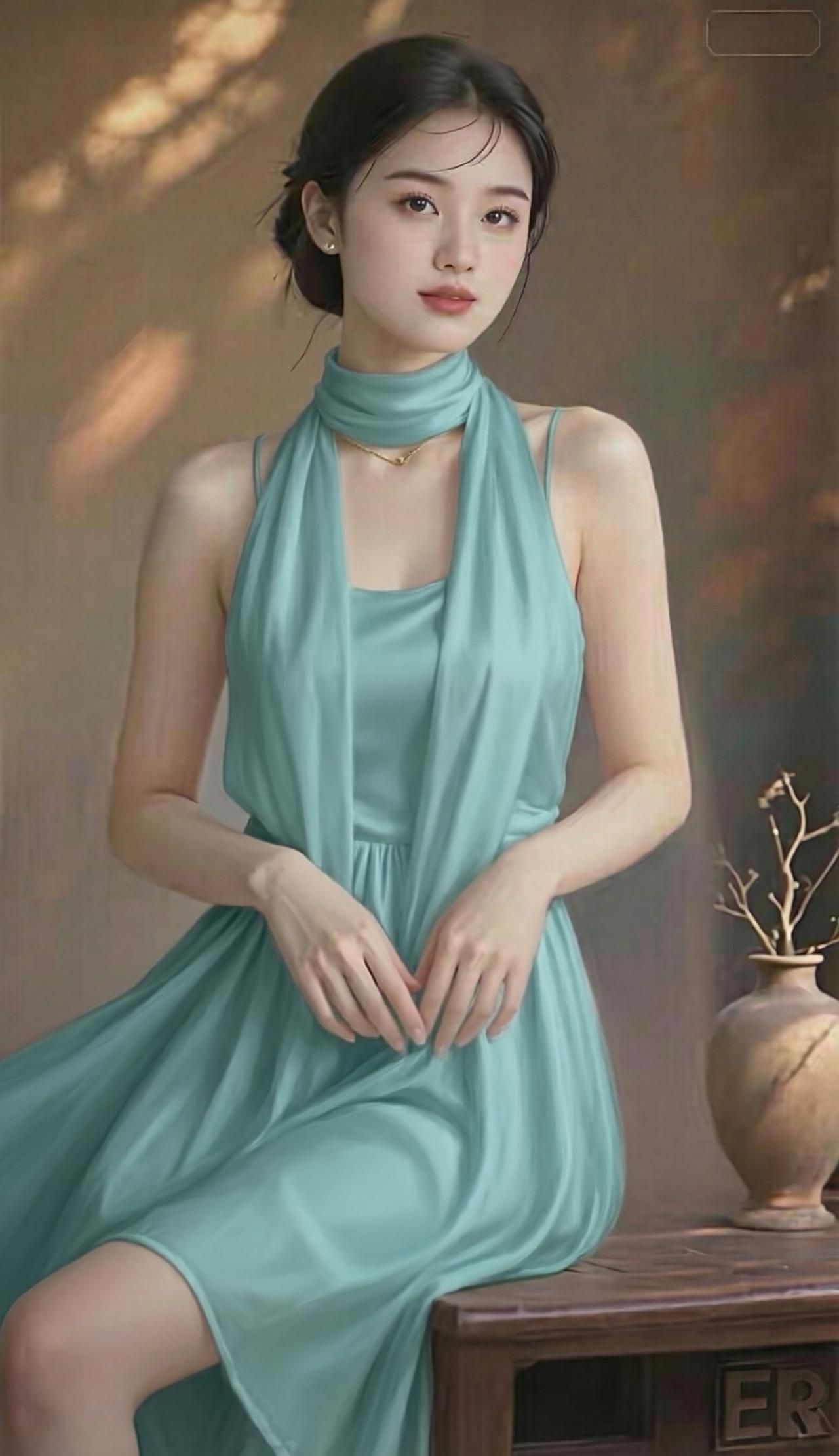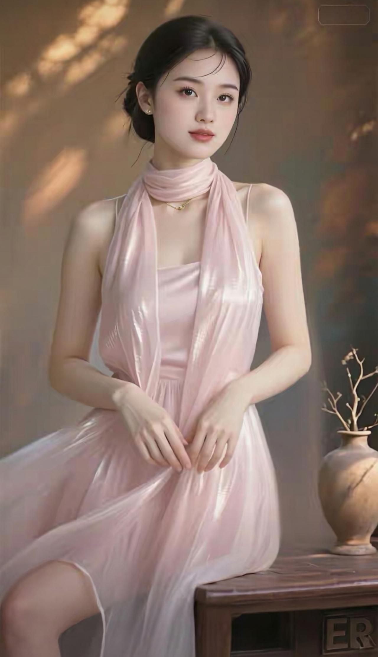 这组照片中的女子气质清冷出尘,宛如古典画卷中走出来的仕女。 她身着一袭挂脖式流光长裙,面料如月光下的湖水般丝滑垂顺,自带细腻光泽。挂脖的设计巧妙地勾勒出优美的天鹅颈与精致锁骨,露出的肩头线条流畅,尽显温婉与性感。 乌黑的秀发被精心盘起,几缕碎发垂落在脸颊旁,增添了几分慵懒与柔媚。她的眉眼如画,眼眸清澈明亮,唇色淡雅,神情恬静淡然,带着一种不食人间烟火的疏离美感。 背景是温润的暖棕色调,光影斑驳,营造出静谧的油画质感。无论是站立还是轻倚,她的姿态都优雅从容,裙摆轻扬,仿佛自带柔光,将东方女性的温婉、灵动与高级感展现得淋漓尽致。