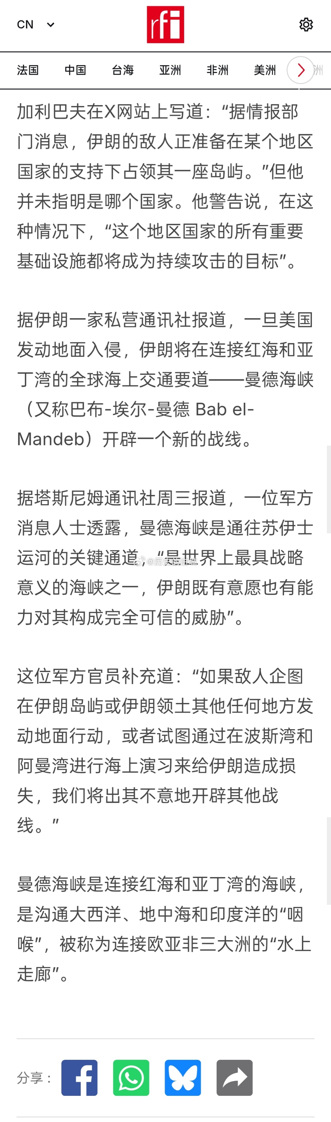 据伊朗媒体报道,一旦美国发动地面入侵,伊朗将在连接红海和亚丁湾的全球海上交通要道——曼德海峡开辟一个新的战线。一位伊朗军方消息人士透露,曼德海峡是通往苏伊士运河的关键通道,“是世界上最具战略意义的海峡之一,伊朗既有意愿也有能力对其构成完全可信的威胁”。海外新鲜事
