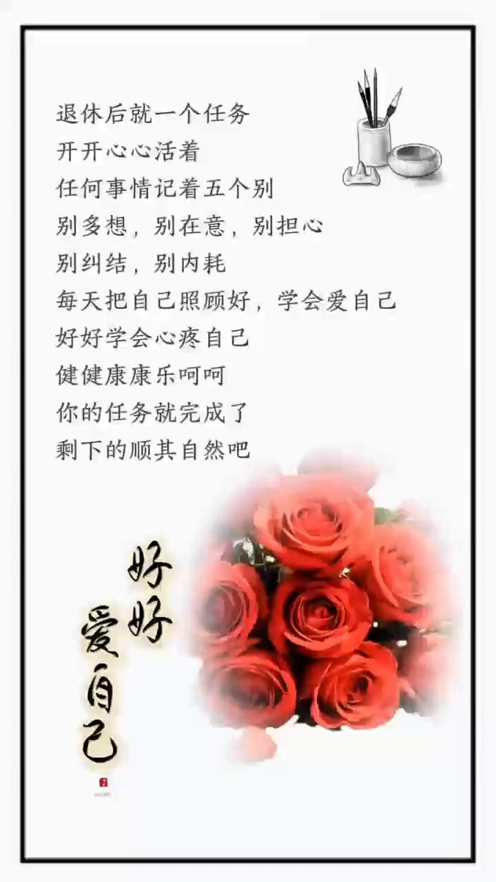 退休后就一个任务,开开心心活着。任何事情记着五个别:别多想、别在意、别担心、别纠结、别内耗。每天把自己照顾好,学会爱自己,好好学会心疼自己,健健康康乐呵呵,你的任务就完成了,剩下的顺其自然吧。爱自己。
