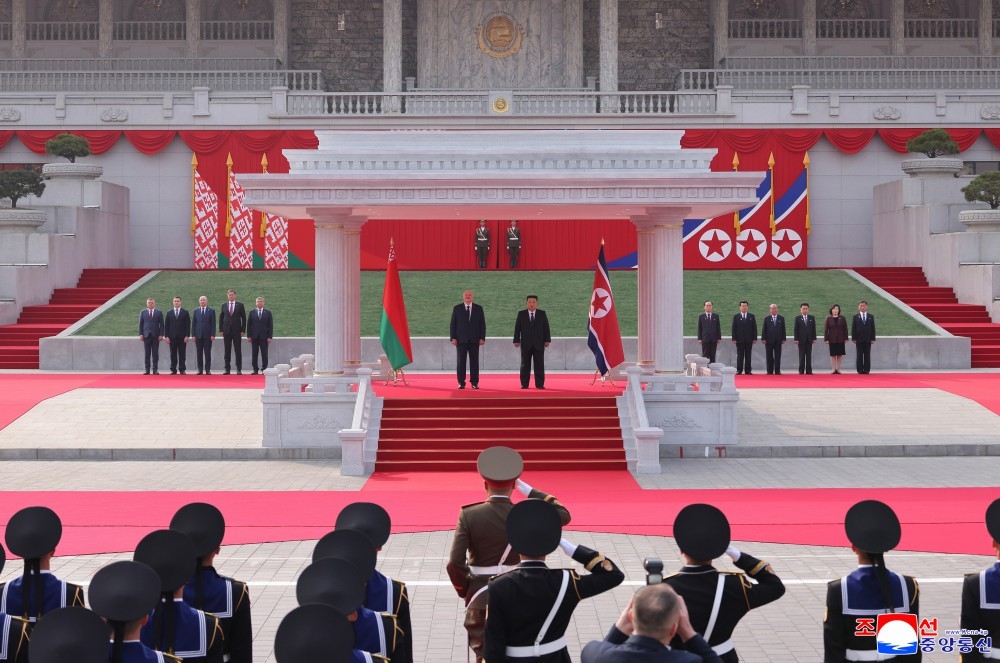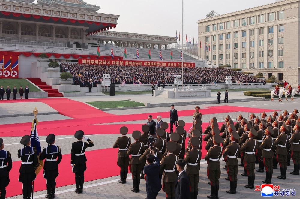 应朝鲜民主主义人民共和国国务委员长金正恩同志邀请,白俄罗斯共和国总统卢卡申科同志对我国进行正式访问,欢迎仪式3月25日在金日成广场举行。