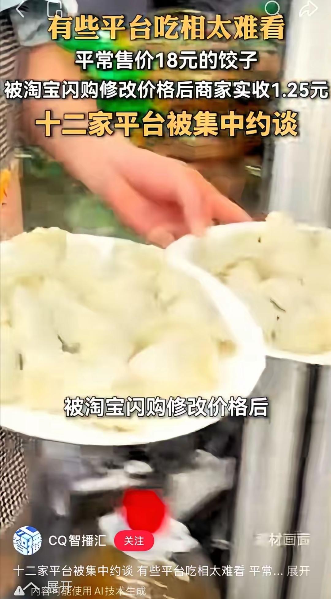 北京一家饺子店老板最近懵了,自家招牌水饺明明卖18元一份,结果后台一查,卖出去一份才到手1.25元!连面粉钱都不够,这生意还怎么做? 店里招牌水饺堂食、线上统一定价18元一份,这份价格是算透了面粉、馅料、人工、房租后的保本微利价,赚的都是起早贪黑的辛苦钱。 可当老板刘先生点开后台结算明细时,看着屏幕上1.25元的单份到账金额,整个人瞬间懵住,心里又凉又涩。 这点钱连一斤面粉的成本都覆盖不了,更别说搭配的馅料、包制的人工,卖得越多,亏得越狠。 这事出在淘宝闪购平台上,后台直接给商家上了“爆品团”活动,价格被改到1.25元,商家自己还关不掉。 2026年3月23日,北京市市场监管局约谈了12家平台,专门通报了这类问题,明确指出平台未经商家同意擅自改价、强制上活动,属于侵害商家自主经营权。 像刘先生这样被“被低价”的商家不是个例,有家烤鸭店整只烤鸭被平台区域经理设成四五十元,卖一单净亏十来块。 监管部门约谈后发了《行政告诫书》,要求平台限期整改,禁止强制商家以低于成本的价格卖东西,但问题是整改效果还得看后续。 外卖平台这两年补贴大战烧了800多亿,表面看消费者得了便宜,实际是平台拿商家的利润去贴用户,商家订单越多亏得越狠。 2025年底出台的外卖新规已经明确要求平台不得强制商户参与促销、不得干预自主定价权,但新规落地需要时间,商家等不起。 四部门最近又印发了算法协商指引,要求平台跟劳动者商量订单分配、收入抽成这些事,覆盖了2000多万外卖骑手,但商家这边的问题还得继续盯。 平台这么干说白了就是欺负小商家没话语权,后台一键改价,商家连说理的地方都找不到。十八块钱的饺子到手一块二,换谁都得懵。监管部门约谈是好事,但光约谈不够,得让平台把后台权限还给商家,自己的店自己定不了价,这生意还叫啥生意。商家要是真扛不住关门了,最后吃亏的还是咱们吃饭的。