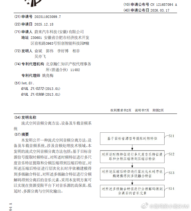 技术巡猎 蔚来 流式空间音频分离方法、设备及车载音频系统---车载音响的好坏,真的只看喇叭数量和功放功率吗?这些当然重要,但还不是根本。真正决定一套车载音响能有多强的,是它能不能"实时听懂"正在播放的音乐。