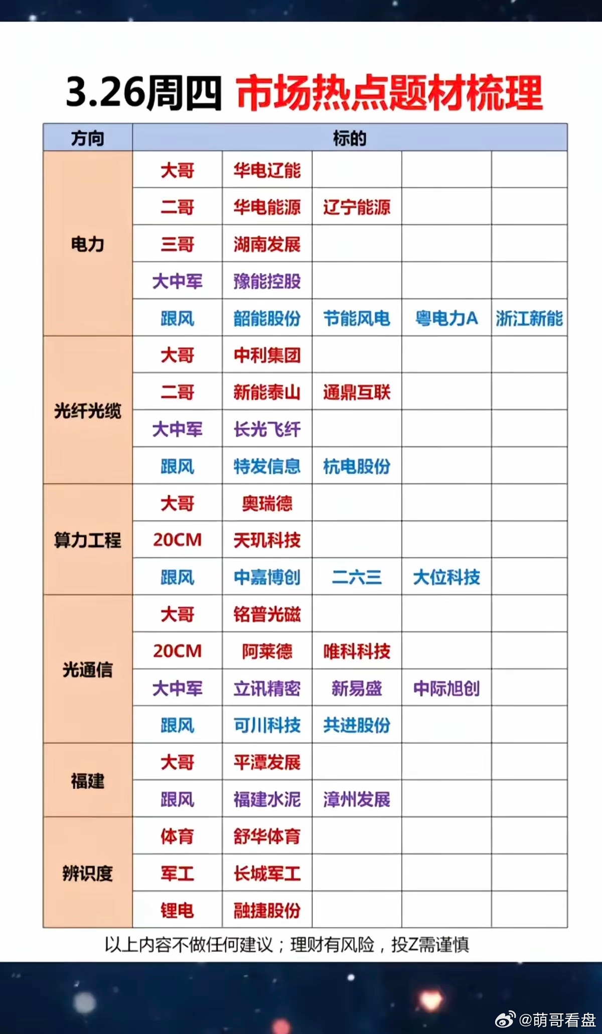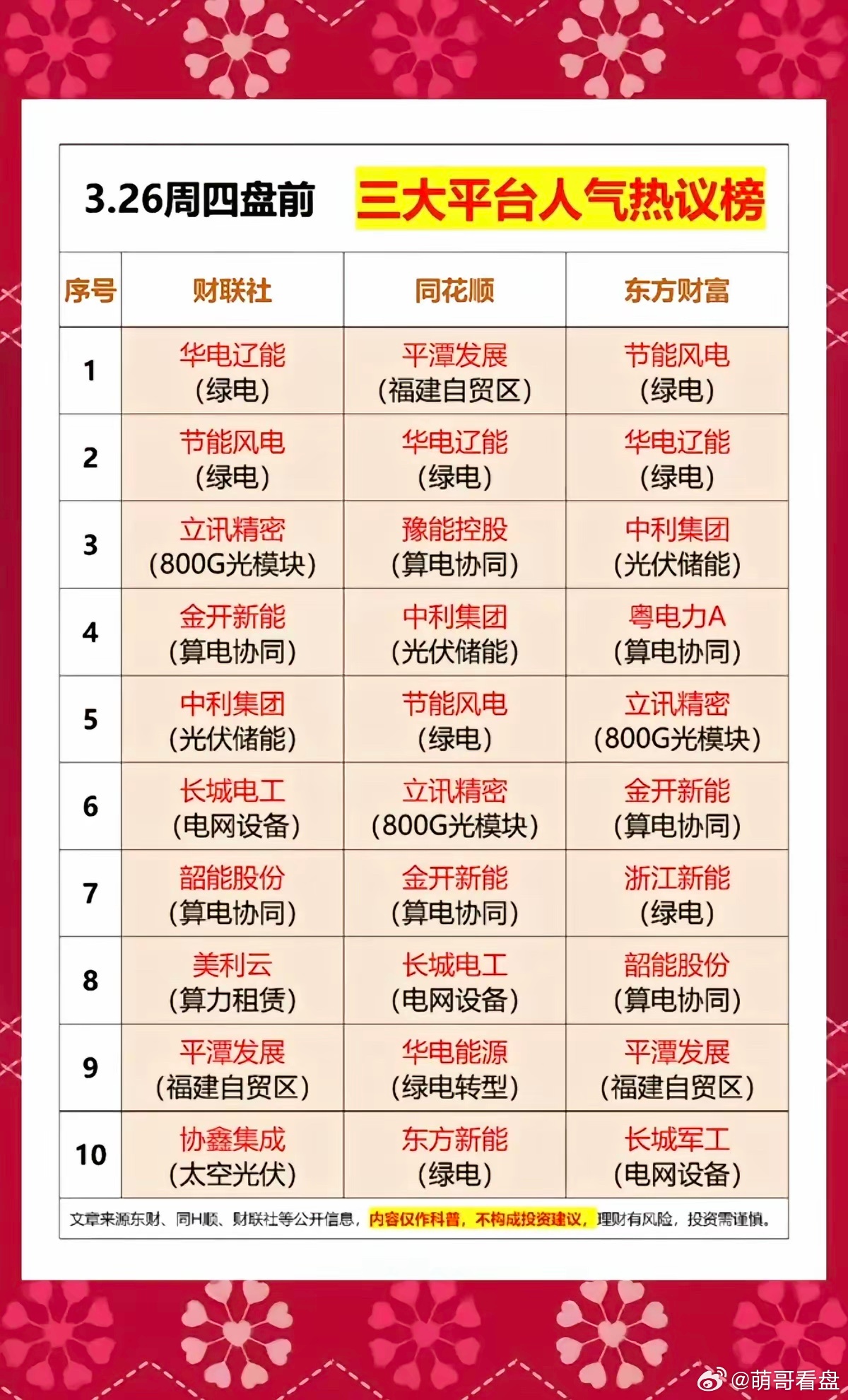 周四盘前人气板块及个股梳理1、电力华电辽能、浙江新能、节能风电、华电能源、华电新能、中闽能源、韶能股份、辽宁能源、粤电力、金开新能2、光纤光缆/光通信长飞光纤、通鼎互联、特发信息、杭电股份、新能泰山、立讯精密、中际旭创、华工科技、共进股份、可川科技3、算力奥瑞德、天玑科技、美利云、光环新网4、福建板块平潭发展、福建水泥、海峡创新、漳州发展5、航天/军工再升科技、长城军工、湖南天雁、建设工业、北方长龙