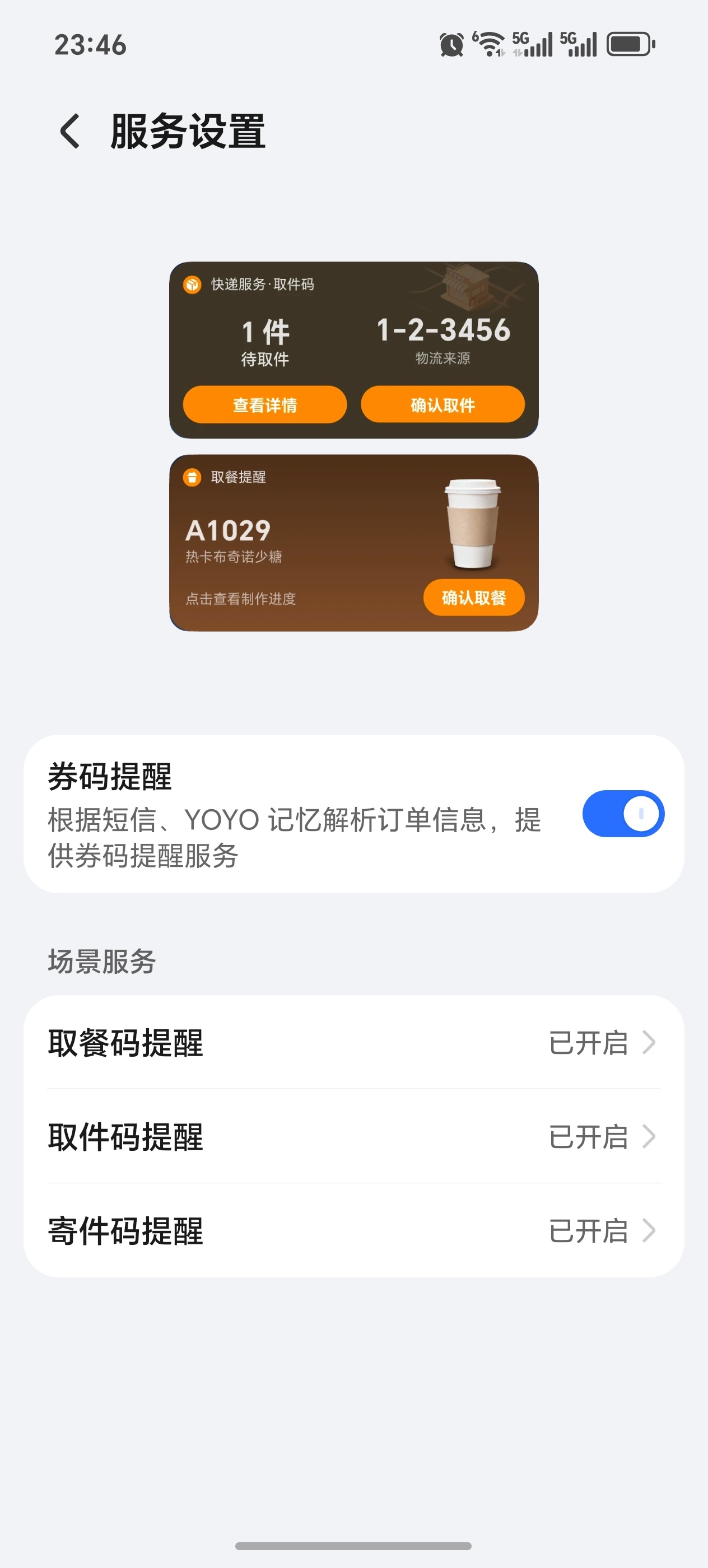 券码提醒顾名思义就是可以记忆取餐码、取件码和寄件码