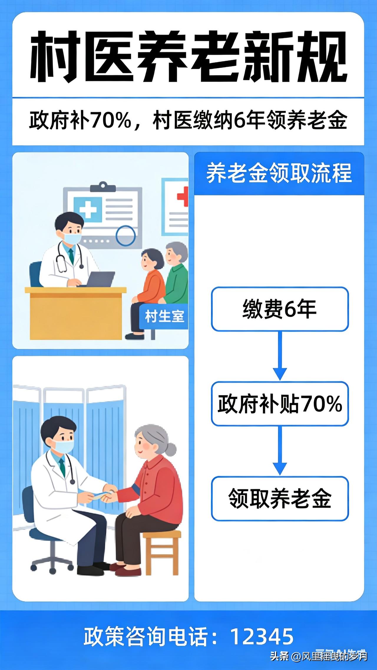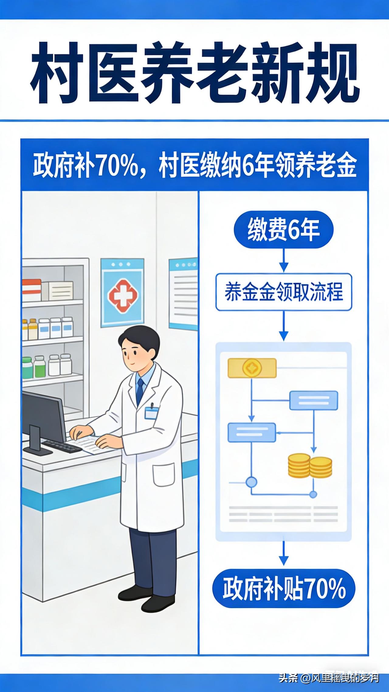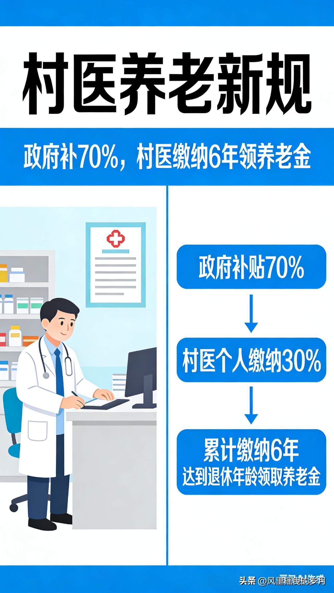 村医养老新规落地:政府补贴70%,仅缴6年即可领养老金,老村医晚年有保障 守护乡村健康的村医群体,终于迎来养老保障的重大利好!针对长期困扰村医的养老难题,多地推出重磅新规,打破传统养老保险“缴费年限长、个人负担重”的壁垒,明确政府承担70%缴费、个人仅缴30%,最低缴费6年即可领取养老金,让坚守乡村医疗一线的村医们,晚年生活有了坚实依靠。 新规核心亮点:减负降门槛,参保更轻松 以往,村医参加养老保险需满足15年最低缴费年限,且个人承担大部分费用,对于收入有限、从业多年的老村医而言,参保门槛过高,不少人因缴费压力大、年限不足而无法享受养老保障。此次新规直击痛点,带来三大核心变化: 1. 缴费比例大幅倾斜:养老保险费用实行分级补贴,县财政补贴40%、镇财政补贴30%,合计70%的费用由政府承担,村医个人仅需缴纳剩余30%,极大减轻经济负担。 2. 缴费年限大幅缩短:将最低缴费年限从15年压缩至6年,即便年龄偏大的老村医,也能在短时间内完成缴费,顺利达到领取养老金的条件。 3. 补缴政策灵活便捷:针对已离岗、未参保的村医,允许一次性补缴6年费用,无需逐年缴纳,让错过参保时机的老村医也能补上养老“缺口”。 政策落地:多地先行试点,惠及万千村医 目前,安徽濉溪县等地区已率先落地该政策,成为全国村医养老保障改革的“样板”。当地明确,村医养老缴费参照村干部标准执行,村卫生室室长每年缴费4403元,普通村医按对应标准执行,政府补贴直接拨付至社保账户,个人仅需承担少量费用。 政策覆盖在岗、离岗两类村医:在岗村医由乡镇卫生院统一组织参保,费用按月代扣代缴;年满60周岁、服务满一定年限的离岗村医,可向属地乡镇卫生院申请参保补缴,审核通过后次月即可领取养老金。资金实行四级财政分担、直达发放,杜绝截留拖欠,确保待遇按时足额到账。 意义深远:稳定村医队伍,筑牢基层医疗根基 村医是乡村医疗的“最后一公里”守护者,他们扎根基层、走村串户,守护着亿万农民的健康。长期以来,养老保障缺失成为制约村医队伍稳定的关键因素,不少年轻村医因顾虑晚年生活选择转行,老村医也面临“干到干不动”却无保障的困境 。 此次新规的出台,是国家完善乡村医疗卫生体系的重要举措,与中办、国办《关于进一步深化改革促进乡村医疗卫生体系健康发展的意见》精神高度契合 。通过降低参保门槛、减轻缴费负担,让村医“在岗有奔头、退休有保障”,既能留住现有村医,也能吸引更多年轻人投身乡村医疗事业,为基层医疗队伍注入新鲜血液,筑牢乡村健康防线。 办理指引:符合条件村医这样参保 1. 申请对象:在岗未参保村医、年满60周岁离岗未参保村医,且具备乡村医生执业资质、服务年限达标。 2. 办理流程:携带执业证书、身份证、服务年限证明等材料,向所在乡镇卫生院提交申请;卫生院初审后,报县卫健局、财政局终审,30个工作日内完成审核 。 3. 待遇领取:缴费满6年且达到法定退休年龄(男60周岁、女55周岁),即可按月领取养老金,工龄越长、缴费档次越高,领取金额越多。 从“赤脚医生”到规范化村医,他们用一生守护乡村健康;如今,养老新规为他们的晚年撑起“保护伞”。随着政策在更多地区推广,万千村医的养老难题将逐步解决,让这份坚守与付出,都能得到温暖的回报。