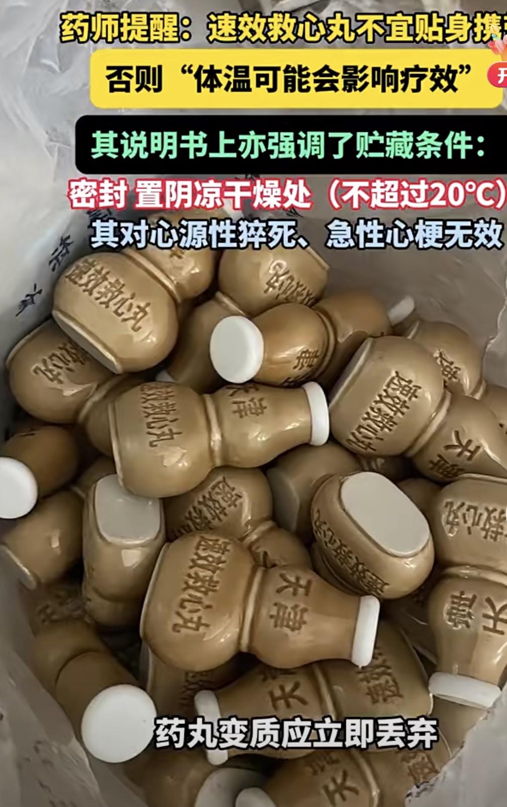 速效救心丸不建议随身携带。 药师提醒:速效救心丸不建议贴身携带。人体体温约37℃,易加速冰片等有效成分挥发;汗液还可能使药丸受潮、粘连,影响药效。 药品应密封置于20℃以下阴凉干燥处,并使用原装避光瓶保存。开封后建议3—6个月内更换,若出现变质现象需立即停用丢弃。