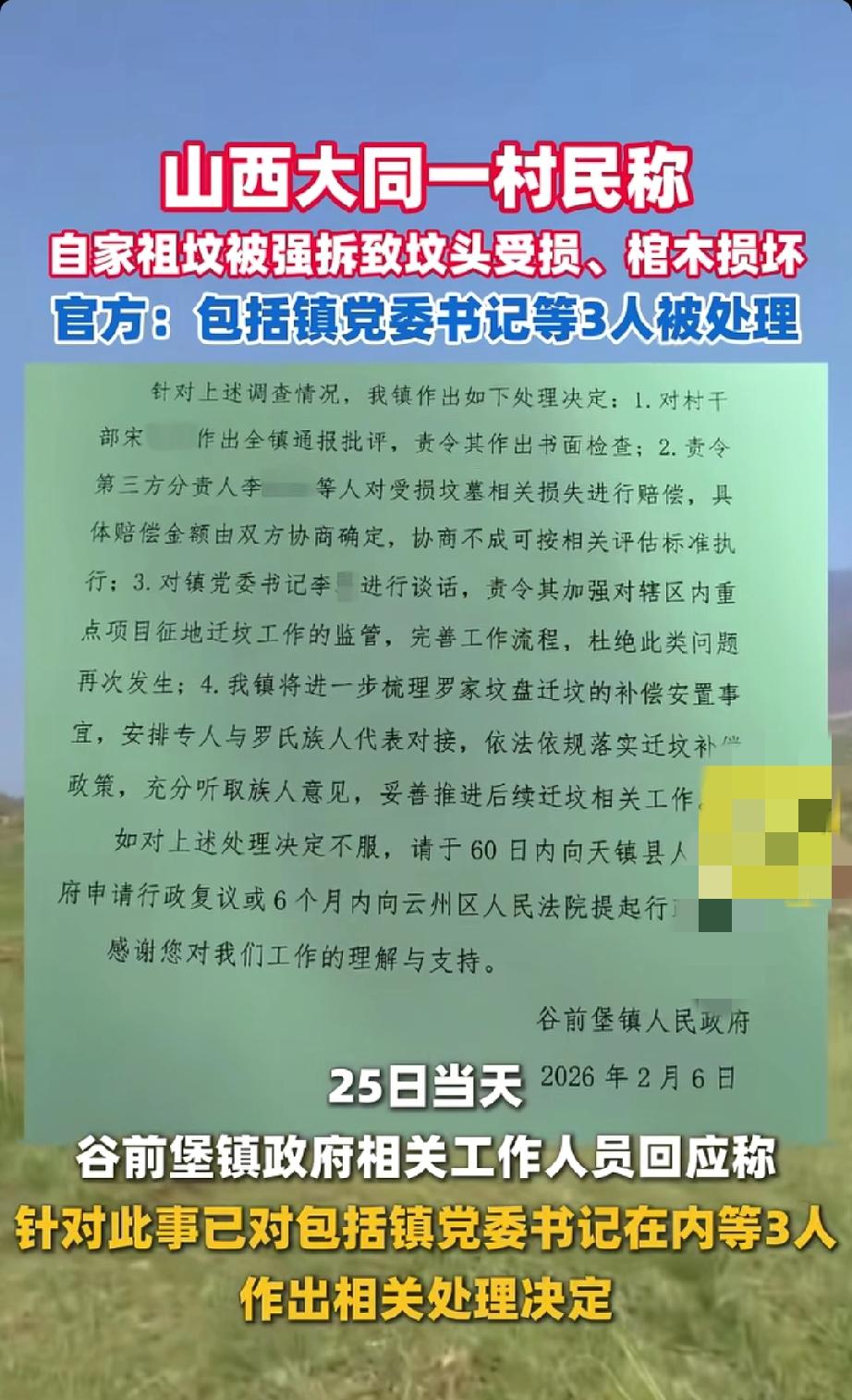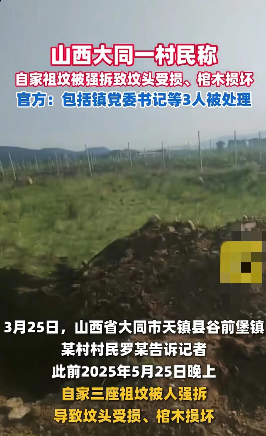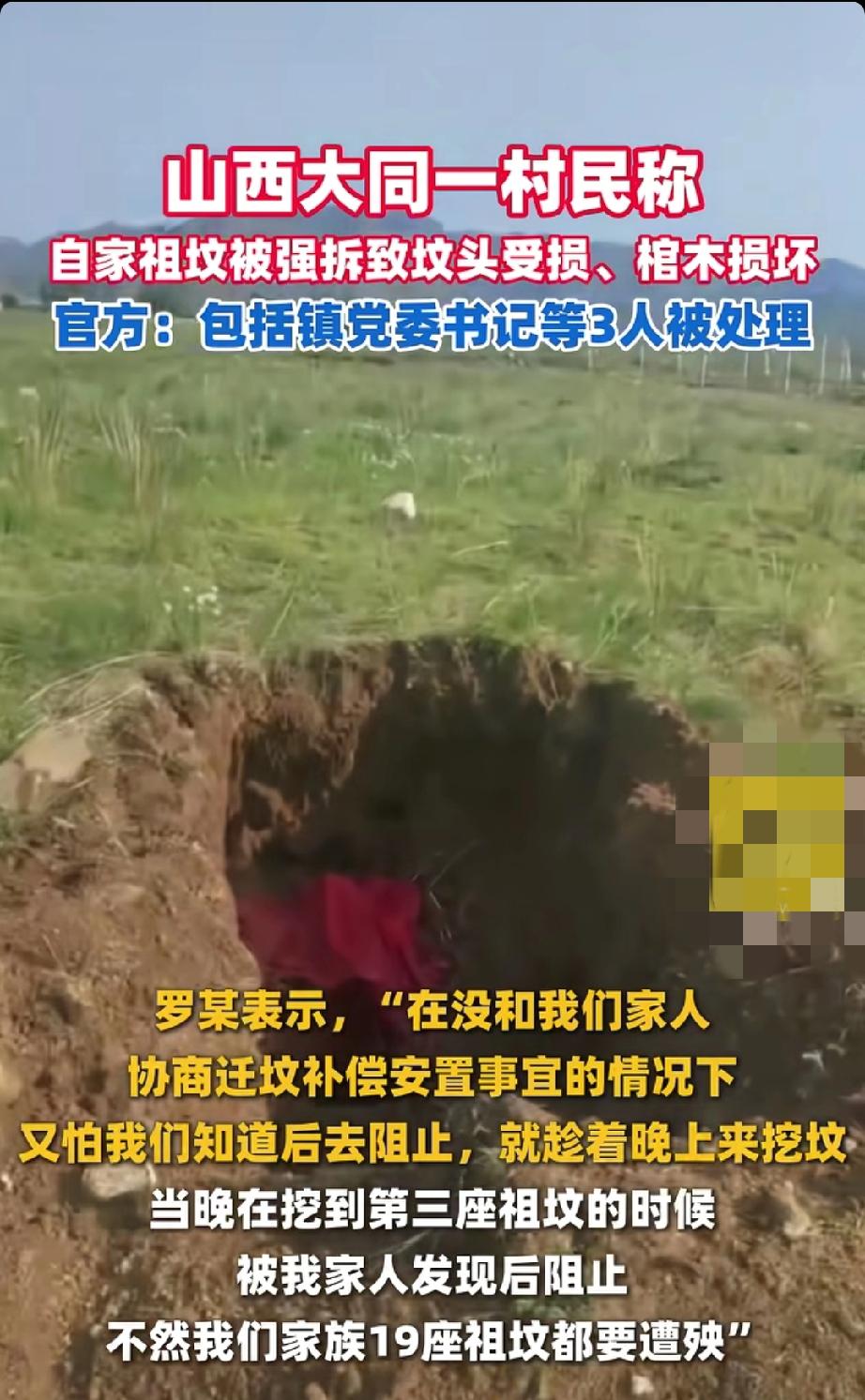 山西大同这起祖坟强拆事件闹得沸沸扬扬。村民罗某称,2025年5月25日晚自家三座祖坟被强拆,棺木损坏,要不是家人及时发现,19座祖坟都危险。其实早在2024年5月镇政府就发了迁坟公告,说是为建酒庄项目。但罗某表示,政府从未和家人协商补偿安置方案,是村干部指使强拆。事发后他们多次反映,问题却没妥善解决。25日镇政府回应,已对包括镇党委书记在内的3人作出处理。祖坟对中国人意义重大,是家族根脉和情感寄托,这种不协商就强拆的做法实在不妥,希望后续能给村民一个合理交代。 农村迁坟 祖坟被强拆 迁坟赔偿 自建房强拆 强拆祖坟 祖屋塌陷 修路迁坟