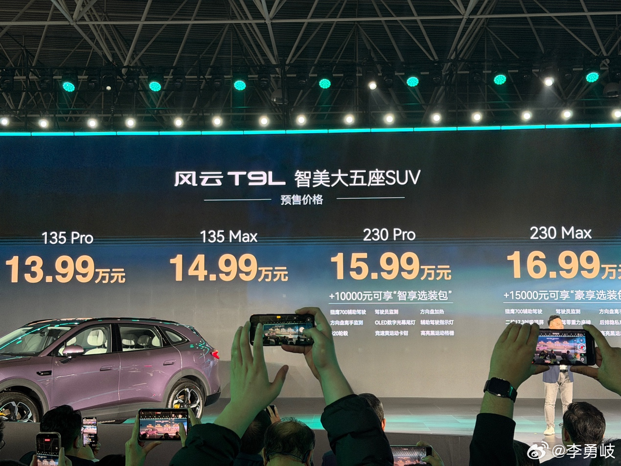 奇瑞风云T9L开启预售,13.99万起!新车定位为大五座中型SUV,其拥有2920mm的轴距、灵犀智能座舱、猎鹰500智能辅助驾驶系统以及鲲鹏AI超能电混CDM6.0,在空间、智能以及续航等方面均有着上佳的表现。如果你在看一台家用SUV,这台车至少值得放进候选清单里!奇瑞风云T9L风云T9L