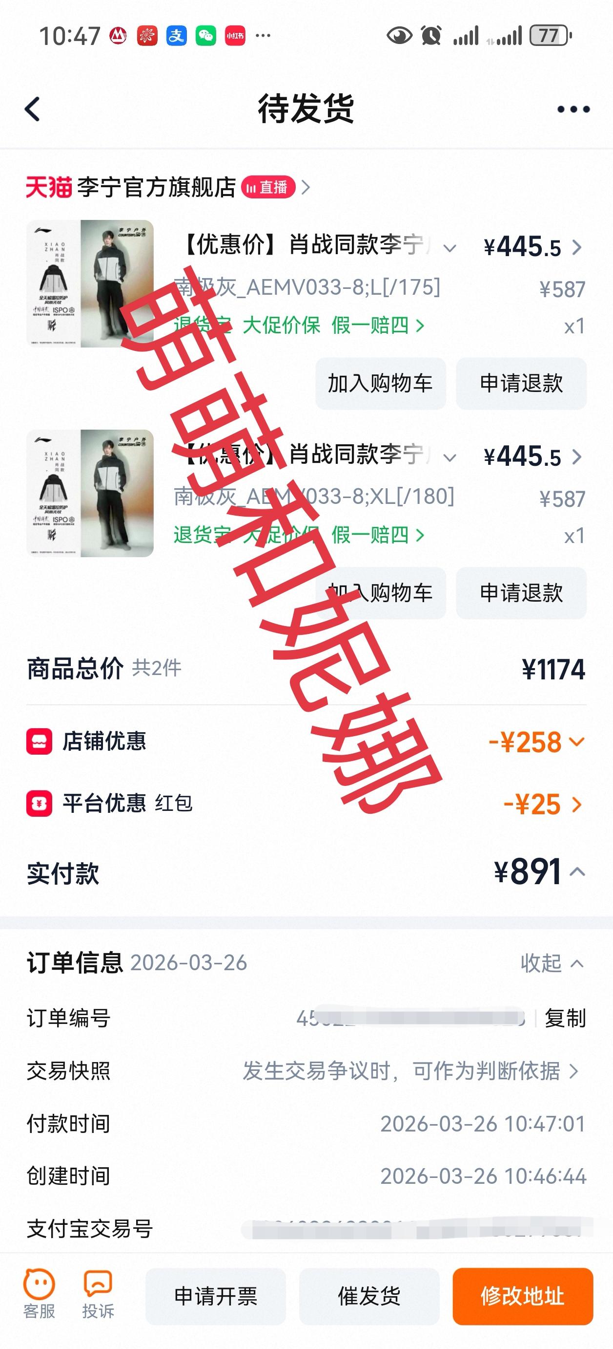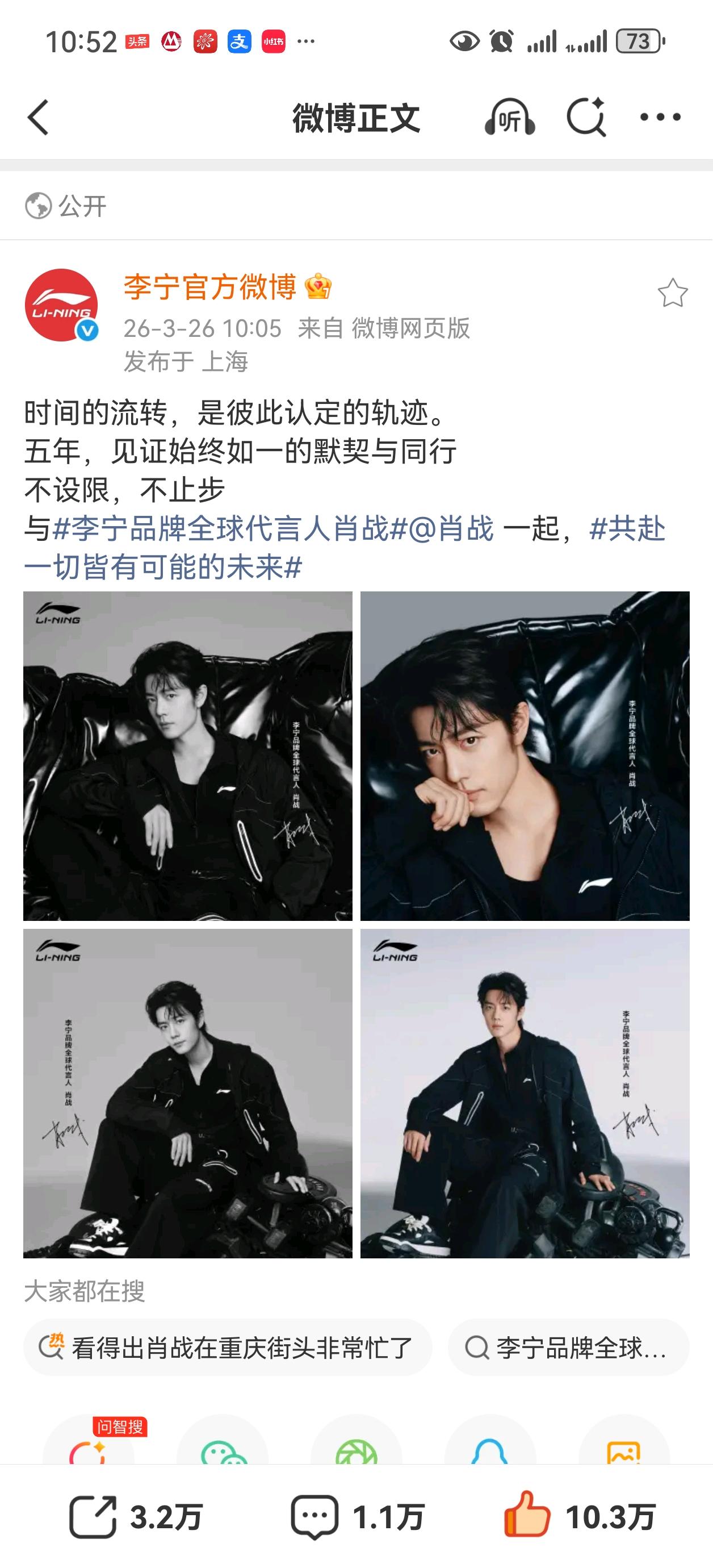 李宁续约了,五年了。给爹妈买了肖战同款冲锋衣,也算情侣装吧,下个月初爹妈要去云南旅游,早晚温差大,正好可以穿,肖战的代言品质都挺好[赞]