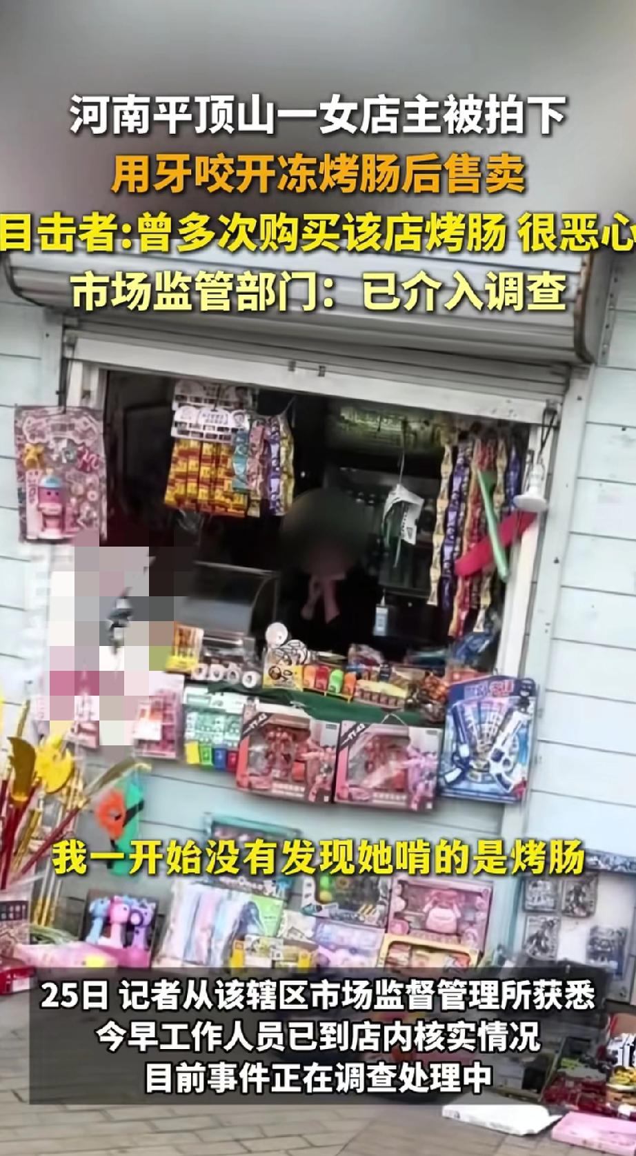 女店主用牙咬开冻烤肠直接售卖,卫生乱象引众怒,市监部门介入调查。 近日,河南平顶山一则小吃店女店主违规处理食材的视频引发全网热议,视频中女店主为图方便,竟直接用牙齿咬开冷冻烤肠的外包装,随后将烤肠徒手放置到烤肠机上加热售卖,如此离谱又不卫生的操作,让众多网友直呼“恶心”“难以接受”,也让大众对街边小吃的食品安全问题再度高度关注。 据目击者拍摄的视频显示,事发于3月24日,涉事小吃店内,女店主面前摆放着一整排粘连在一起的冷冻烤肠,因烤肠外包装粘连难以徒手撕开,该店主未使用剪刀、刀具等正规工具,也未做任何手部清洁,直接拿起烤肠凑到嘴边,用牙齿逐一咬开塑料外包装,咬开后的烤肠未经任何清洁处理,便被直接摆上烤肠机,准备向顾客售卖。目击者表示,自己此前曾多次在这家店购买烤肠,无论是自己食用还是给宠物购买,看到店主这般操作后,只觉得无比反胃,难以想象此前吃下的烤肠,都是以这样不卫生的方式处理的。 视频在网络上传播后,迅速引发网友强烈反响。不少网友表示,街边烤肠是深受大众喜爱的小吃,尤其是年轻人和儿童,而食品经营最基本的就是卫生底线,用牙齿咬开食材包装,不仅存在极大的卫生隐患,店主的口腔细菌、唾液极易沾染到烤肠上,同时冷冻烤肠的塑料外包装也可能含有有害物质,经牙齿撕咬后更容易残留,严重危害消费者的身体健康。还有网友质疑,该店主毫无食品安全意识,为了省事完全不顾及消费者的健康,这样的经营行为理应受到严厉查处,也希望相关部门能加强对街边小吃店、流动摊贩的日常监管,杜绝此类乱象发生。 事件曝光后,当地市场监督管理所迅速行动,于3月25日安排工作人员前往涉事店铺进行现场核实,对店铺的食材处理流程、卫生状况、经营资质等展开全面调查,目前事件正在进一步处理中。市场监管部门表示,将严格按照食品安全相关法律法规,对查实的违规行为依法依规严肃处罚,同时会加大辖区内食品经营商户的排查力度,强化食品安全宣传教育,督促经营者严格遵守食品操作规范,守住食品安全底线。 食品安全无小事,尤其是直接入口的街边小吃,经营者的卫生习惯和操作规范直接关系到消费者的身体健康。无论是大型餐饮机构还是小型小吃店,都应严格遵守食品安全操作流程,做好个人卫生、食材处理、餐具消毒等各项工作,坚守食品安全底线。而消费者在购买食品时,也应留意商家的操作卫生情况,发现违规行为及时向相关部门举报,共同维护安全、放心的食品消费环境。 截至目前,涉事店铺尚未就此事作出公开回应,市场监管部门的调查处理结果也待进一步公布,后续进展将持续关注。烤肠摊主 烤肠经营 商超烤肠 门店加工烤肠