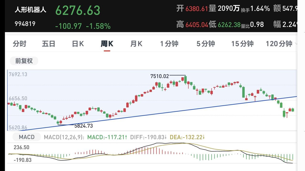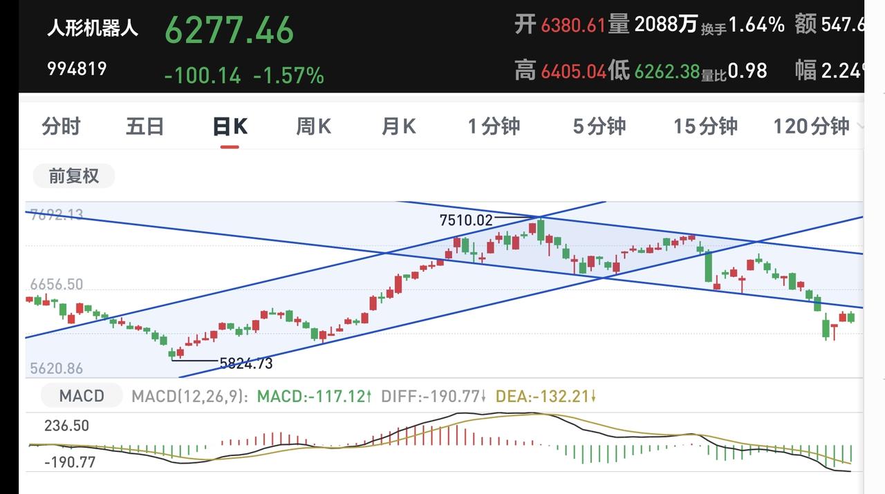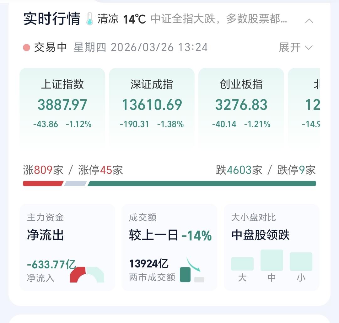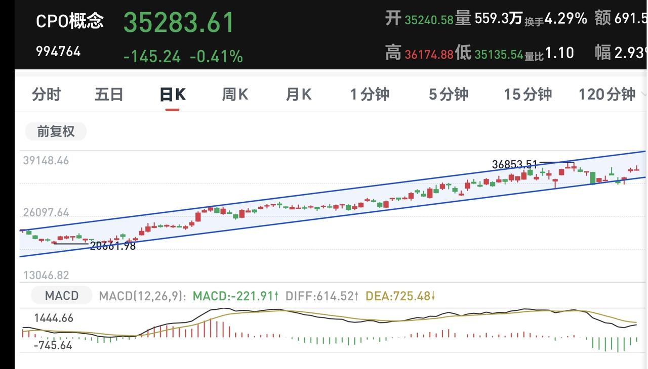 基金:市场震荡向下,但没有必要慌乱 市场下午开盘以后震荡向下,三大指数的下跌幅度都已超过了1%以上,创业板指下跌了1.17%,盘中点位3278点,上证指数下跌了1.09%,盘中点位3888点。 整个股票市场,上涨809家,下跌4603家,涨停45家,跌停9家,上涨家数少于下跌家数。 持有的基金中,盘中估值盈利的只有新能源汽车板块和海外互联网板块,估值亏损金额最大的三个板块是:证券板块,芯片半导体板块,5G板块,估值整体亏损了9444元。 整个基金市场,上涨5535家,下跌14118家,没有上涨幅度超过5%的基金,也没有下跌幅度超过5%的基金。 图9是今天板块的上涨排行榜,上涨幅度最大的三个板块是:锂矿板块,海外医药板块,亚太板块,图10是今天板块的下跌排行榜,下跌幅度最大的三个板块是:金融科技板块,存储芯片板块,恒生科技板块,图11是今天基金的加仓和减仓人数,加仓4147130人,减仓2241603人,加仓人数超过了减仓人数。 整个市场主力资金净流入最多的三个板块是:电池板块,能源金属板块,建筑材料板块,主力资金净流出最多的三个板块是:国企板块,高端制造板块,蓝筹策略板块。 1:下午黄色线还是在蓝色线下方,两条线之间的敞口并不是很大,还存在反转的可能性。 2:两市累计成交13924亿,相比于昨天同期缩量了14%,主力资金净流出633亿,说明在刚才这一轮震荡向下的过程中,并没有大量恐慌盘涌出。 3:下午主要还是观察3881点的得失,如果跌破3881点,甚至是收盘点位在3881点之下,再创新低就是大概率事情,如果还是收在3881点和3955点之间,就还是处于正常的震荡走势状态中。 4:商业航天板块日线级别处于下跌趋势中,前几天下跌跌破了下跌通道的下轨线,进入加速下跌状态。最近一直是在下跌通道下方震荡,日线级别的下跌趋势还没有被改变。 商业航天板块周线级别处于上涨通道中,本周震荡的最低点就是在这个上涨通道下轨线上,并没有跌破这个上涨通道的下轨线,在没有有效破位这个上涨通道下轨线之前,长线持有的人都可以继续持有。 5:Cpo板块日线级别处于上涨通道中,今天的下跌并没有跌破这个上涨通道的下轨线,在有效破位日线级别上涨通道下轨线之前,短线持有的人都可以继续持有。 Cpo板块周线级别处于上涨通道中,现在的位置距离上涨通道的下轨线比较远,小幅度的下跌都改变不了周线级别的上涨趋势,长线持有的人可以继续持有。 6:机器人板块日线级别处于下跌趋势中,前几天下跌跌破了日线级别下跌通道的下轨线,进入了加速下跌走势。最近几个交易日都是在这个下跌通道下方震荡,在日线级别下跌趋势被改变之前,短线持有的人都需要保持谨慎的态度。 机器人板块周线级别的上涨趋势已经被破坏,而且是有效破位了,周线级别的上涨趋势,长线持有的人需要注意风险。 到现在为止还是没有跌破3881点,到现在为止的震荡还是在正常的范围之内,只要不跌破3881点的震荡都不要惊慌,继续观察盘面的状态,有观点以后我会第一时间分享。 今天究竟应该怎么办?我会在评论区留言。 置顶文章是我参加活动的,大家可以点进去看一下有没有点赞,没有点赞的人帮忙点一下赞,谢谢大家的支持。